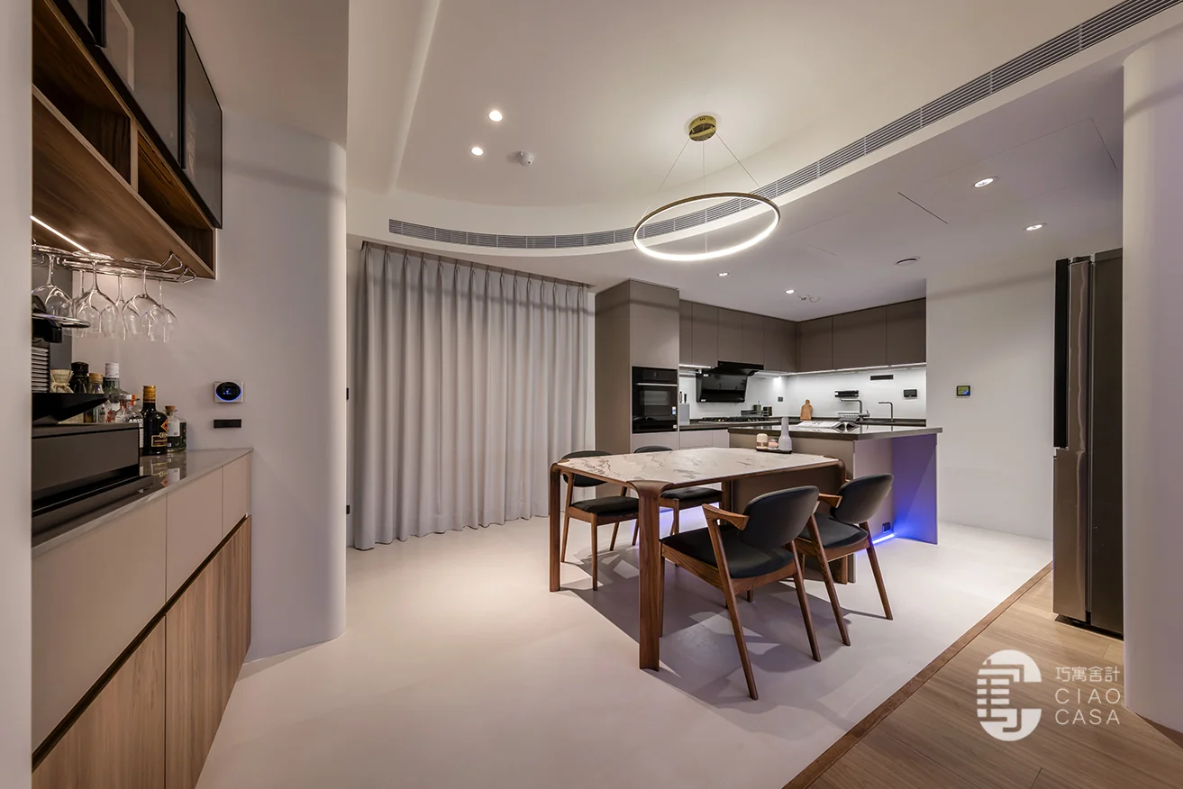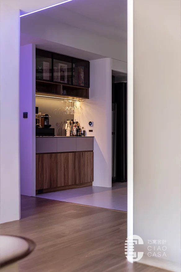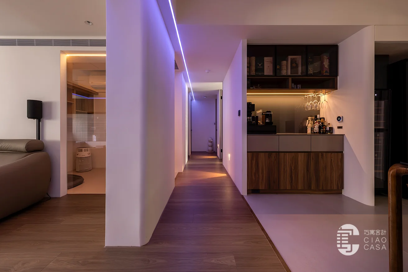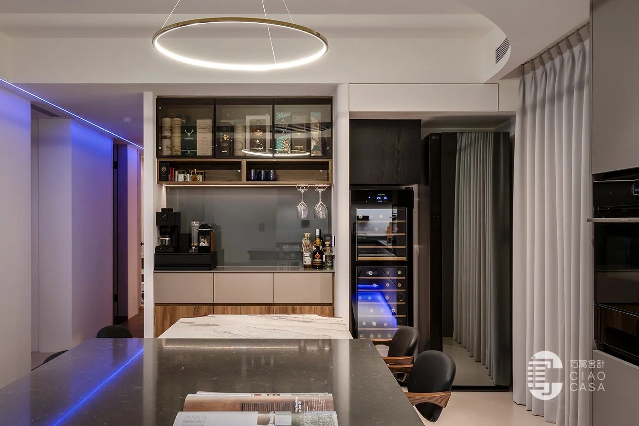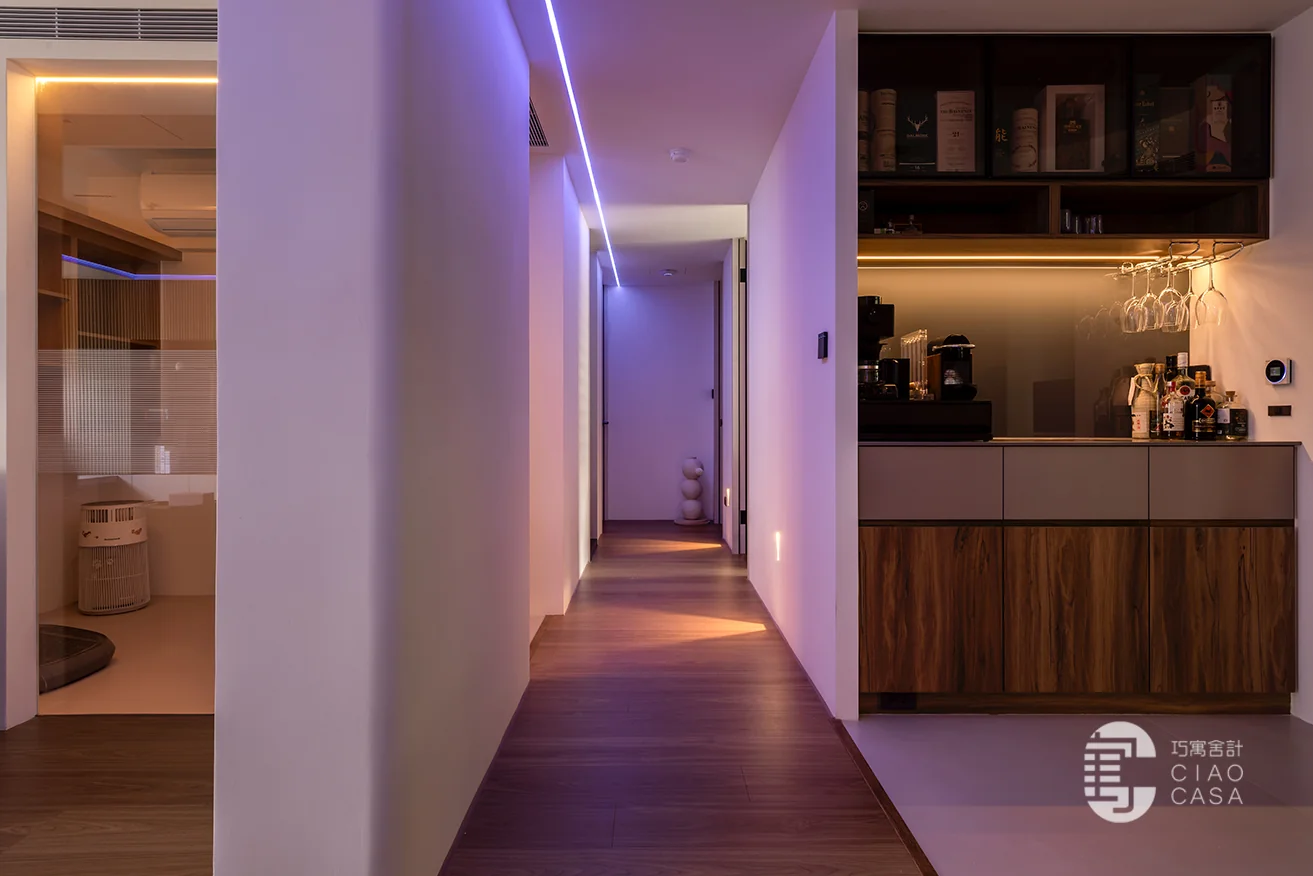 通往私領域的廊道,捨棄常見的投射燈,以線燈與地燈鋪陳深邃而綿長的氛圍。光影伏流、張力漸生,塑造出富含未來感的科幻語境,亦為轉換心境、沉澱情緒埋下伏筆。餐廳一隅則規劃為酒吧區,設有紅酒櫃與智能衣櫃,延伸更多生活機能與品味場景。