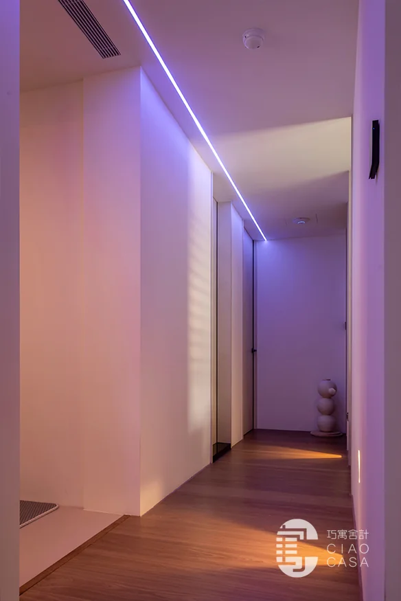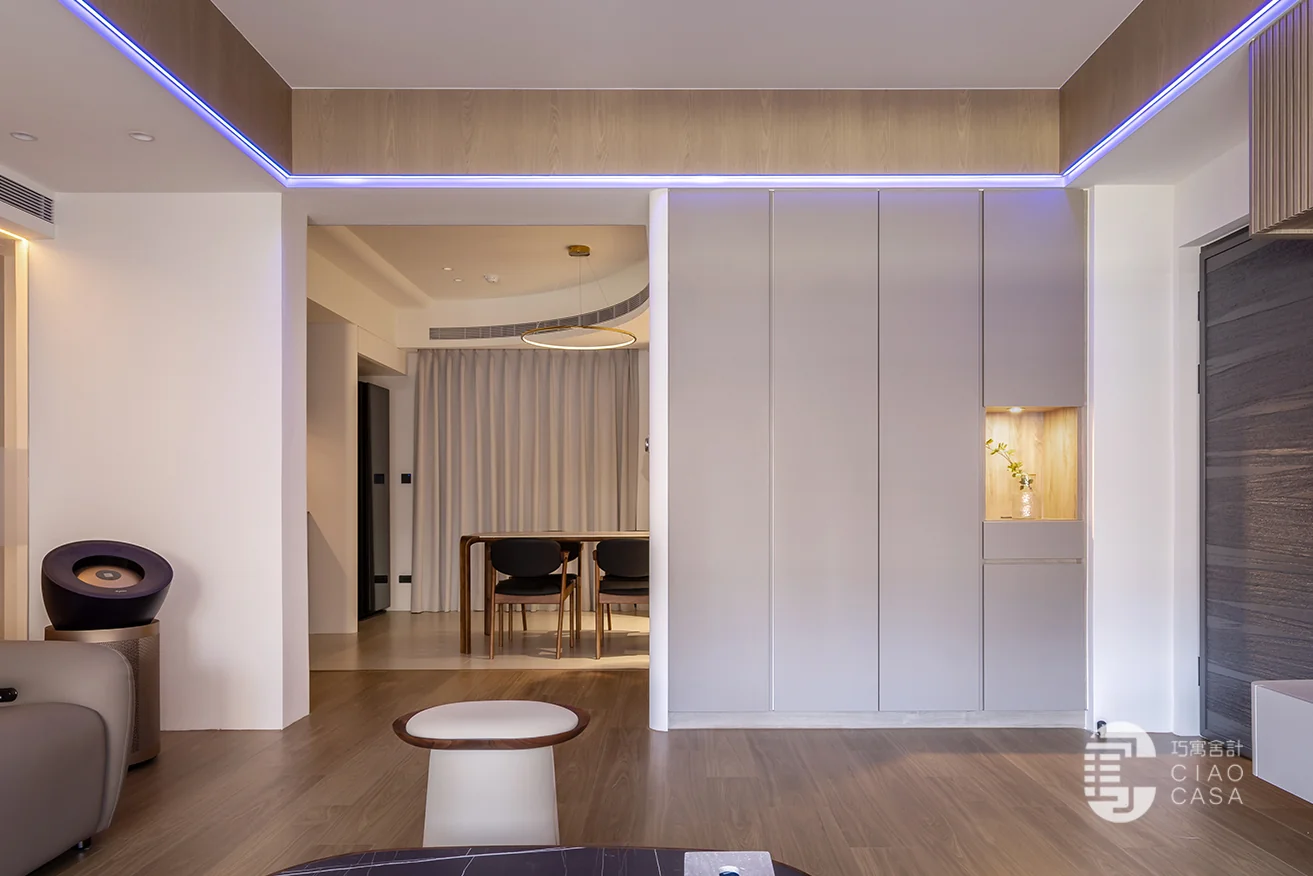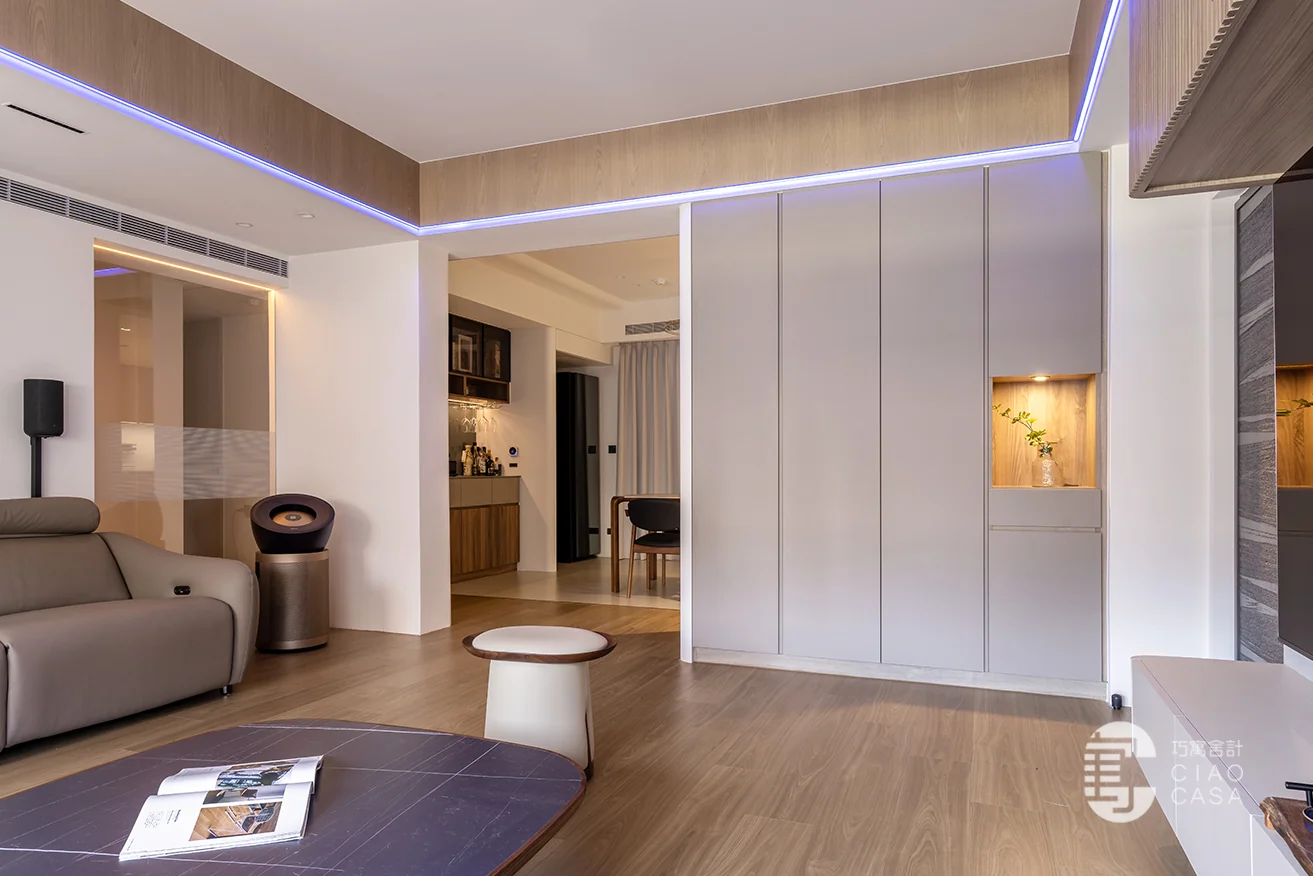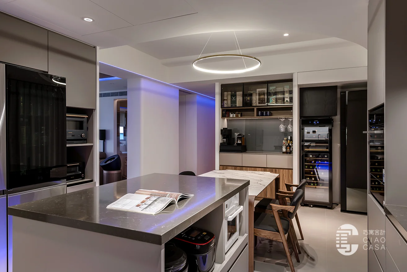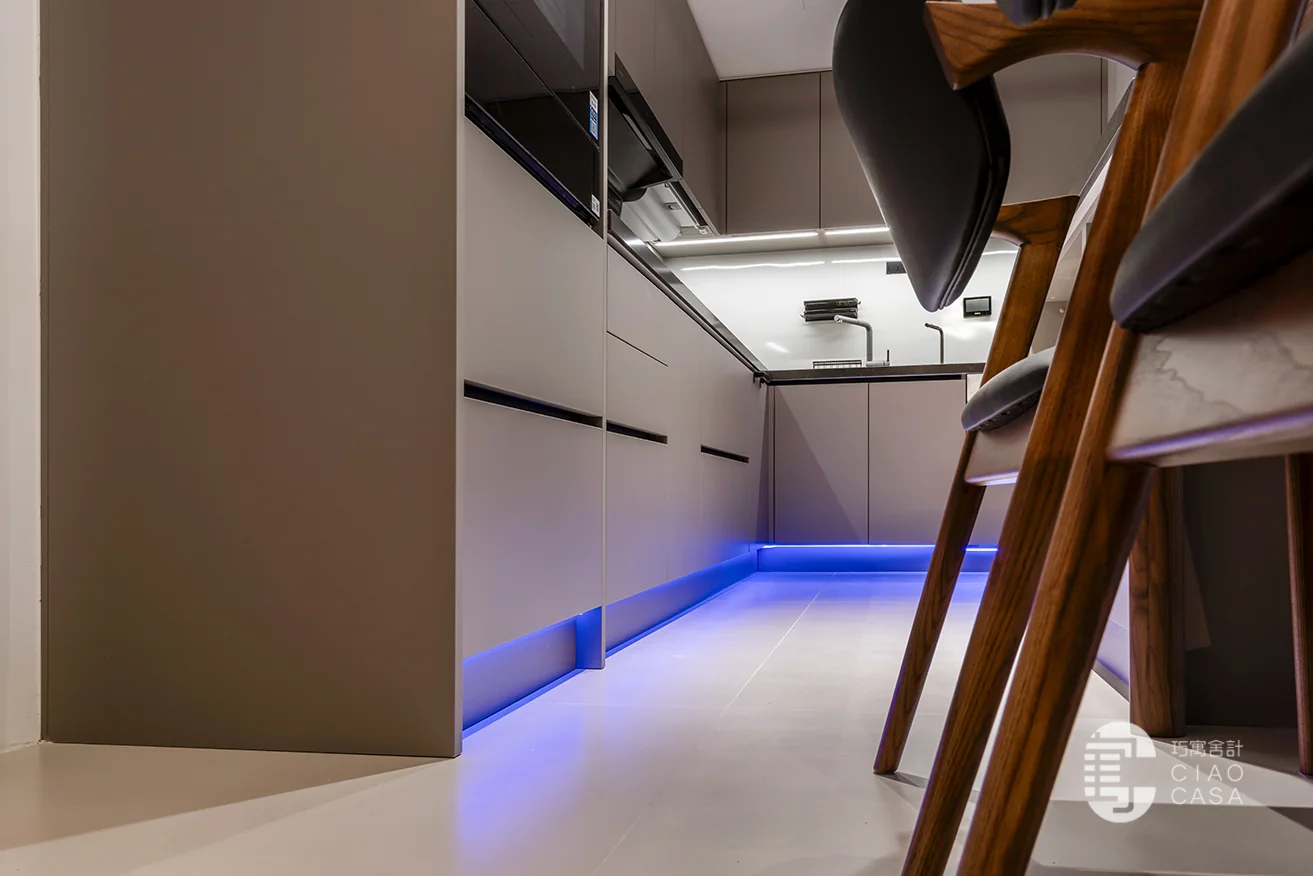 通往私領域的廊道,捨棄常見的投射燈,以線燈與地燈鋪陳深邃而綿長的氛圍。光影伏流、張力漸生,塑造出富含未來感的科幻語境,亦為轉換心境、沉澱情緒埋下伏筆。餐廳一隅則規劃為酒吧區,設有紅酒櫃與智能衣櫃,延伸更多生活機能與品味場景。