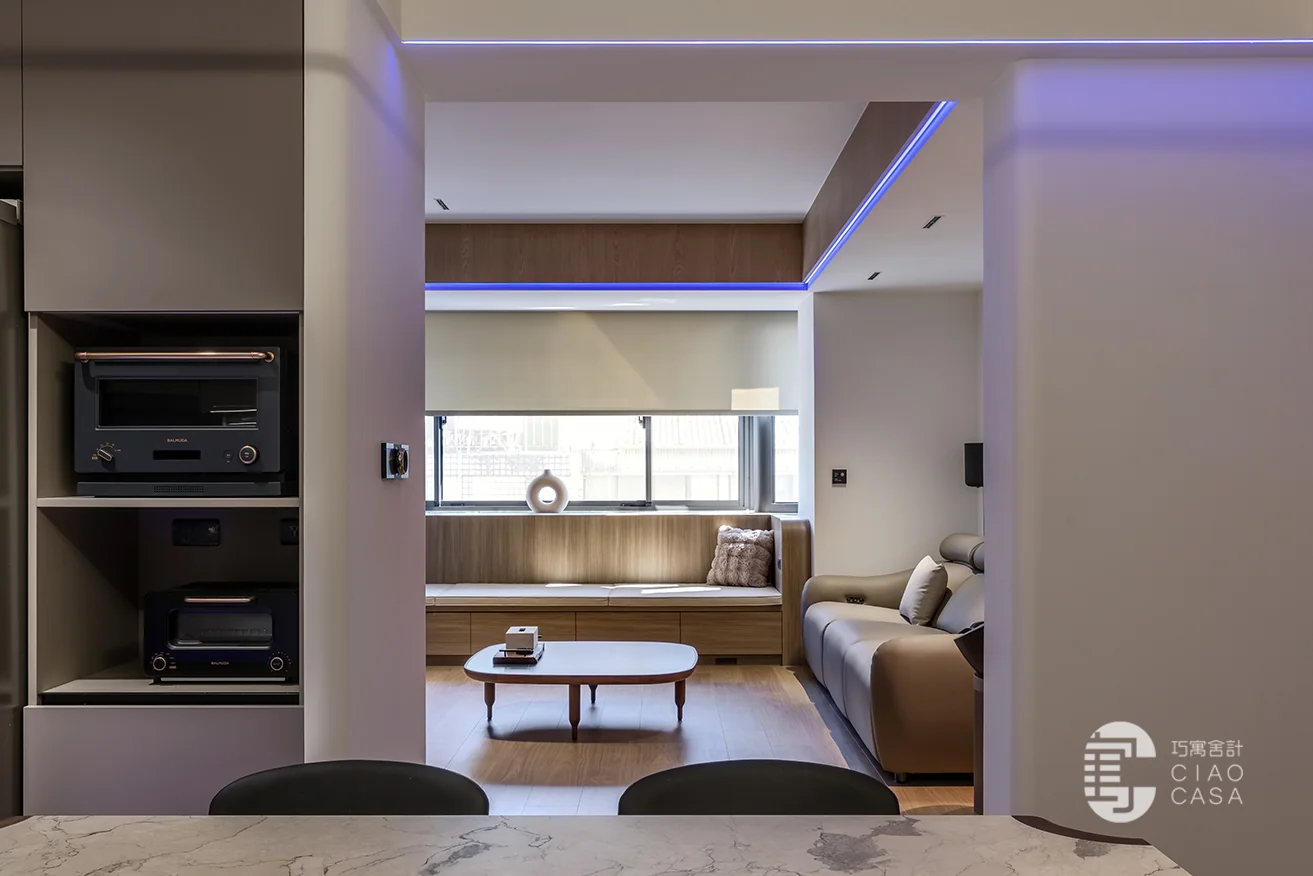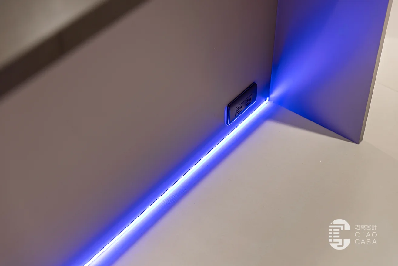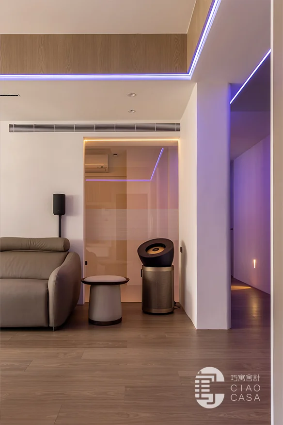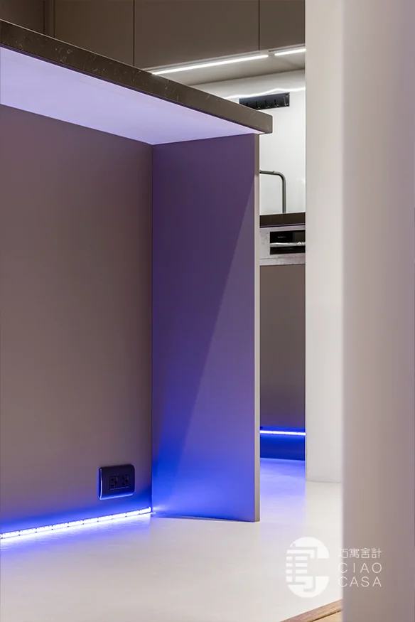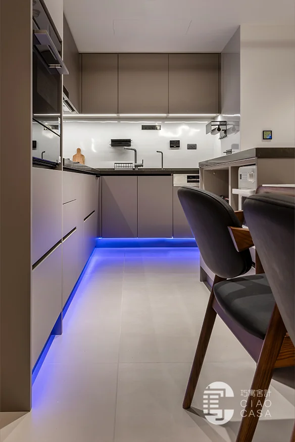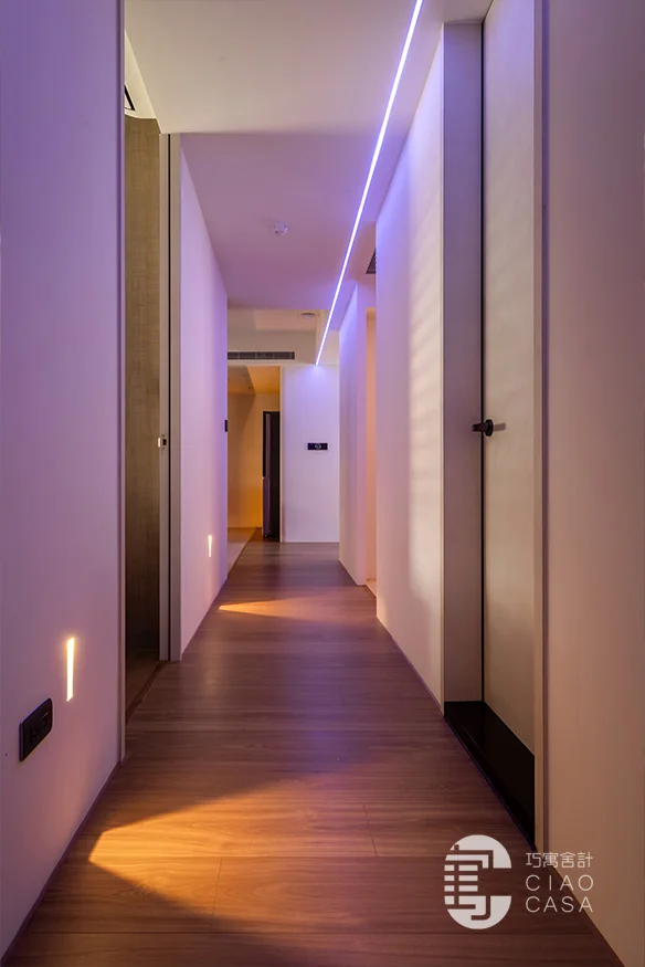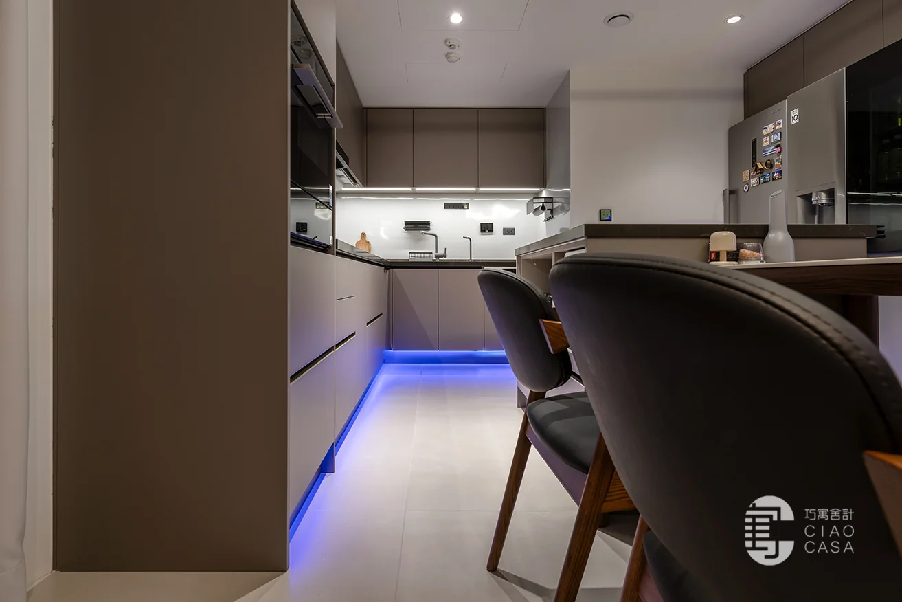 通往私領域的廊道,捨棄常見的投射燈,以線燈與地燈鋪陳深邃而綿長的氛圍。光影伏流、張力漸生,塑造出富含未來感的科幻語境,亦為轉換心境、沉澱情緒埋下伏筆。餐廳一隅則規劃為酒吧區,設有紅酒櫃與智能衣櫃,延伸更多生活機能與品味場景。