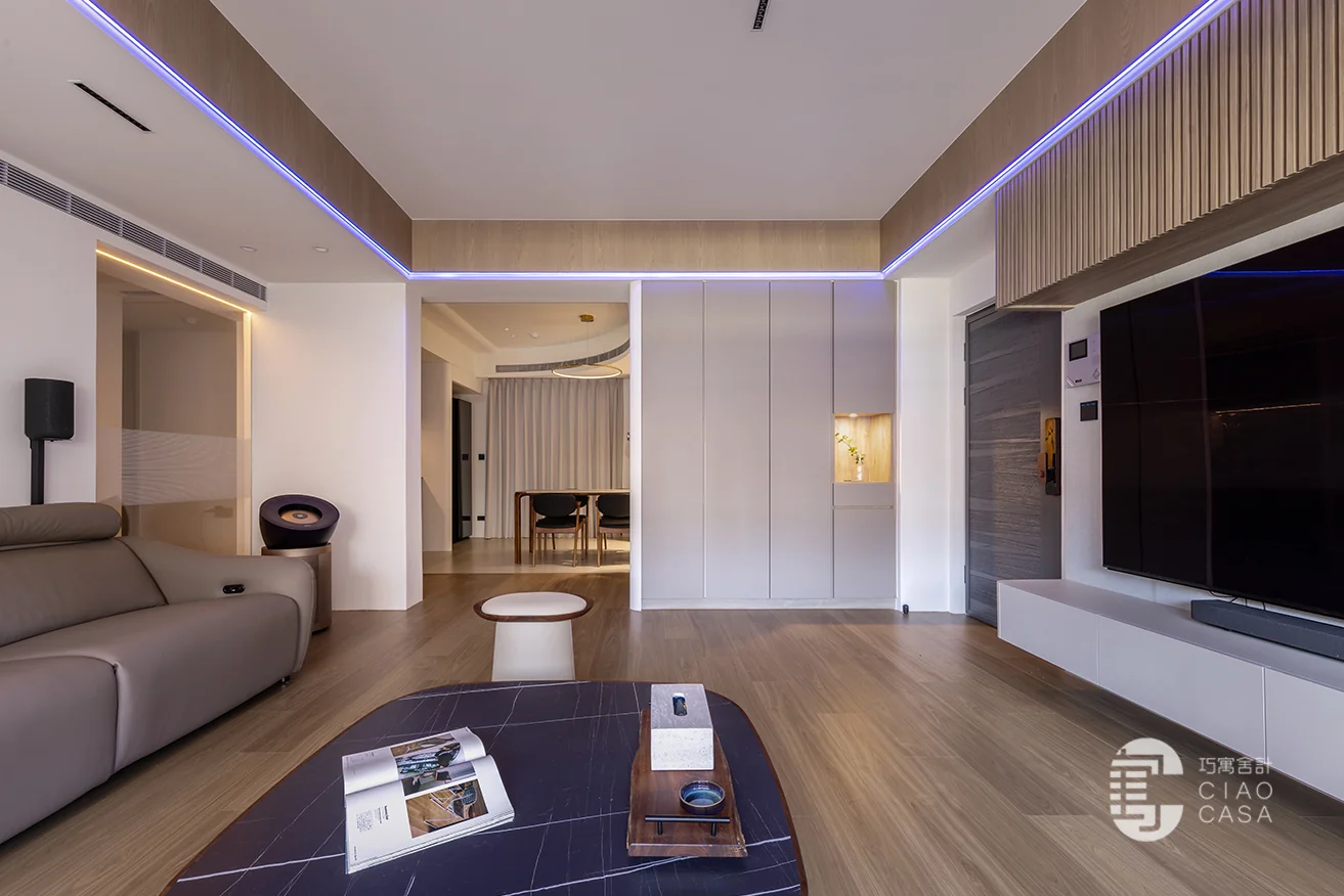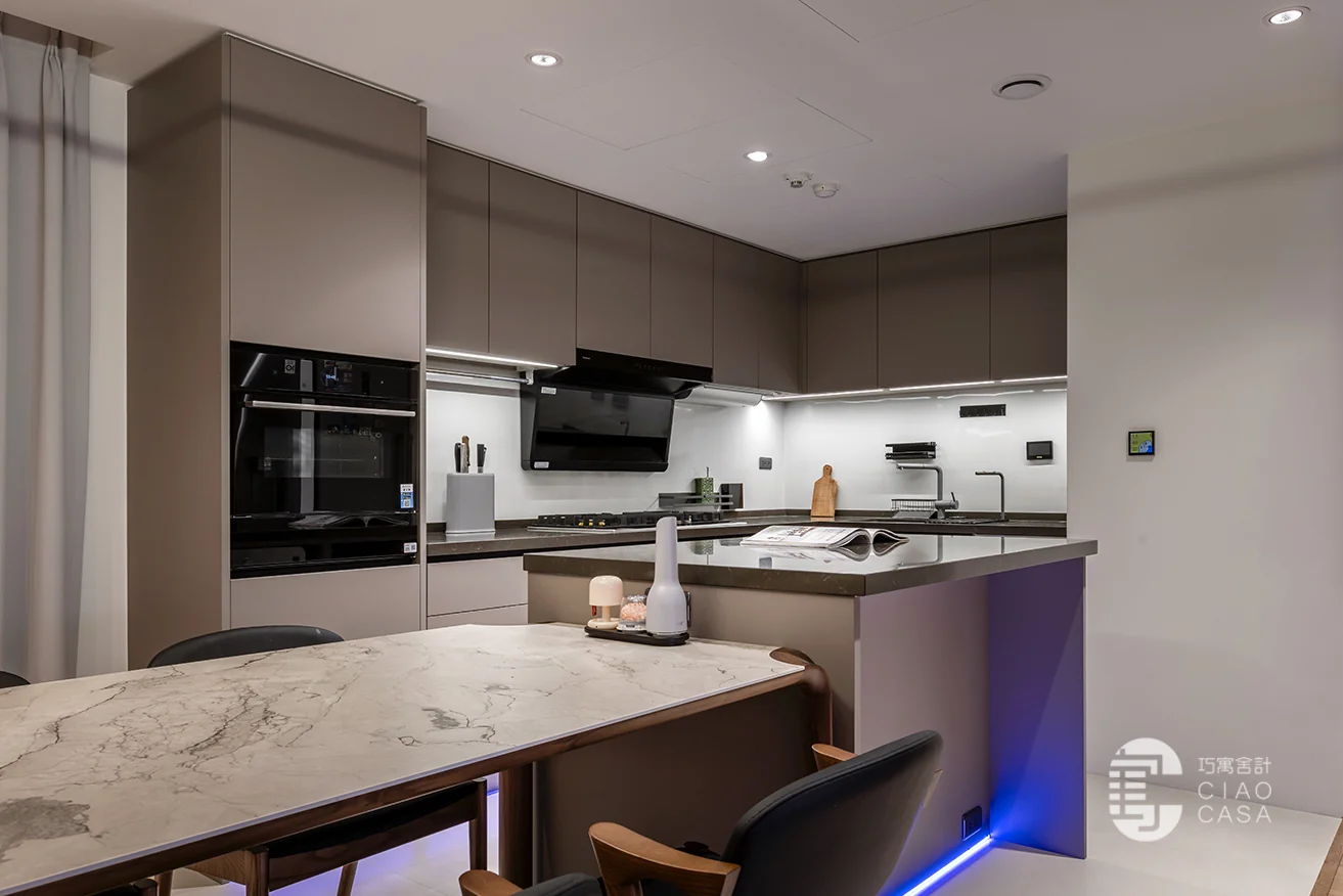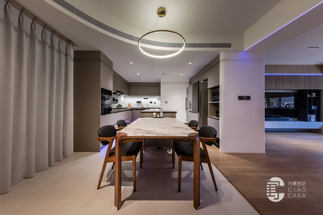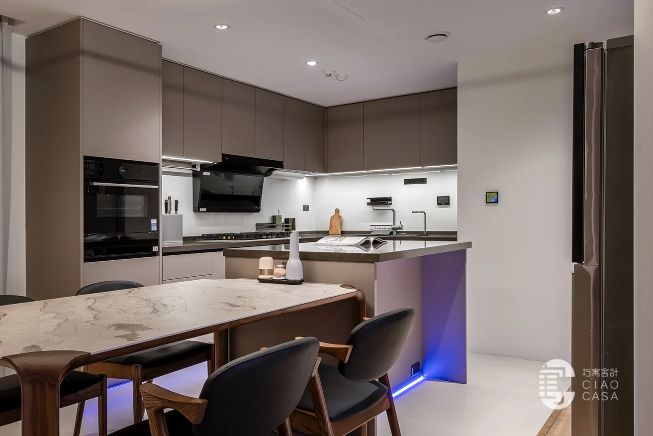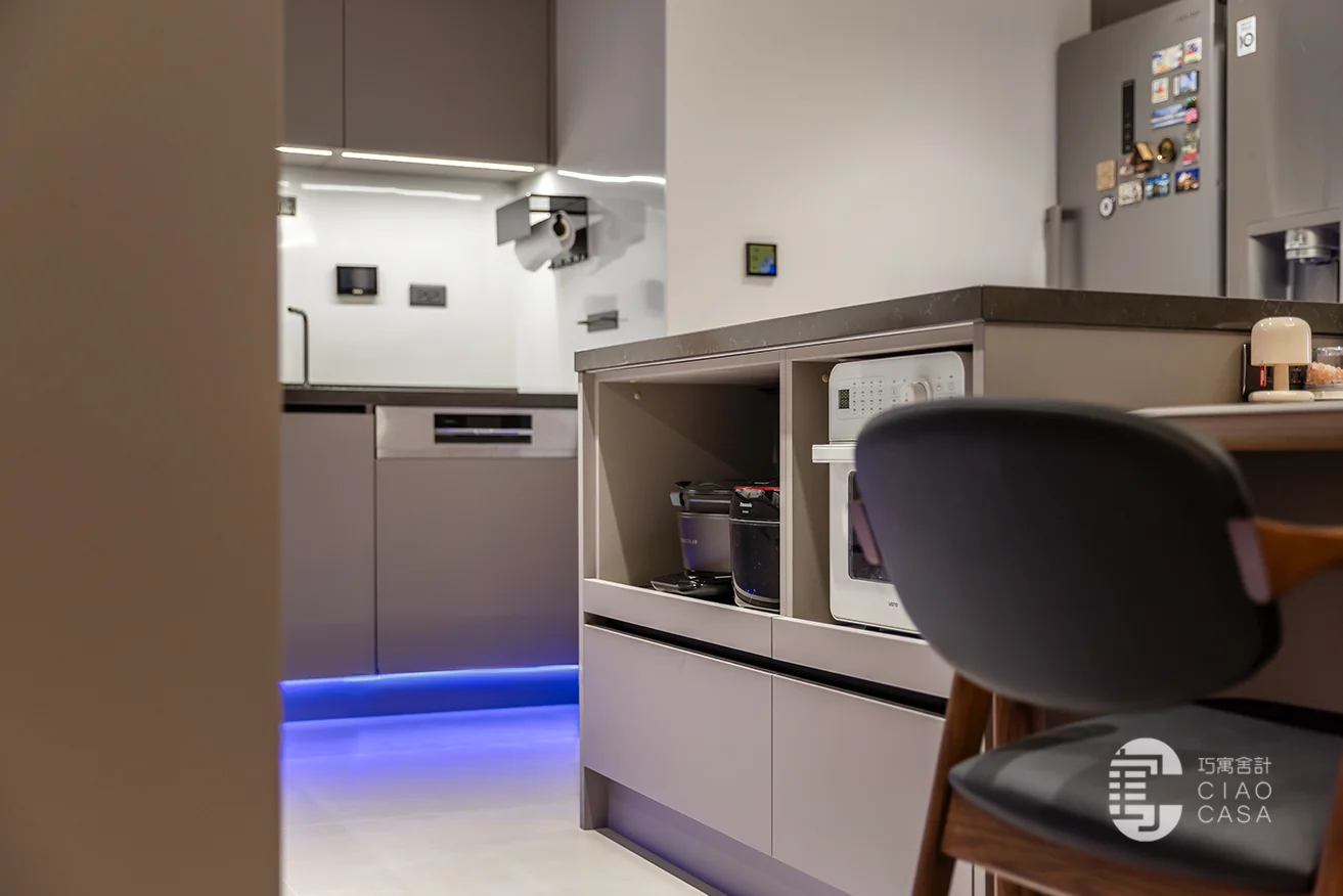 通往私領域的廊道,捨棄常見的投射燈,以線燈與地燈鋪陳深邃而綿長的氛圍。光影伏流、張力漸生,塑造出富含未來感的科幻語境,亦為轉換心境、沉澱情緒埋下伏筆。餐廳一隅則規劃為酒吧區,設有紅酒櫃與智能衣櫃,延伸更多生活機能與品味場景。