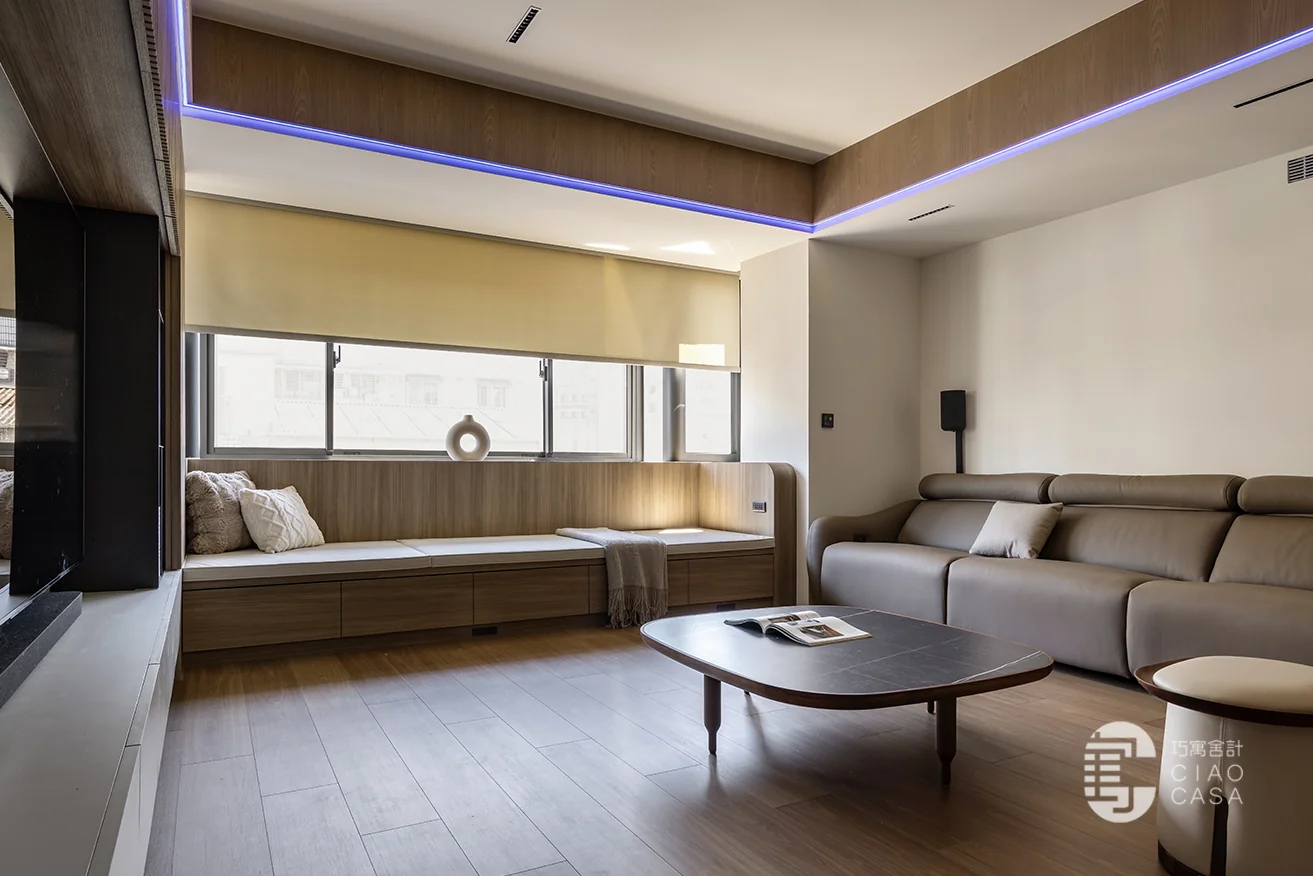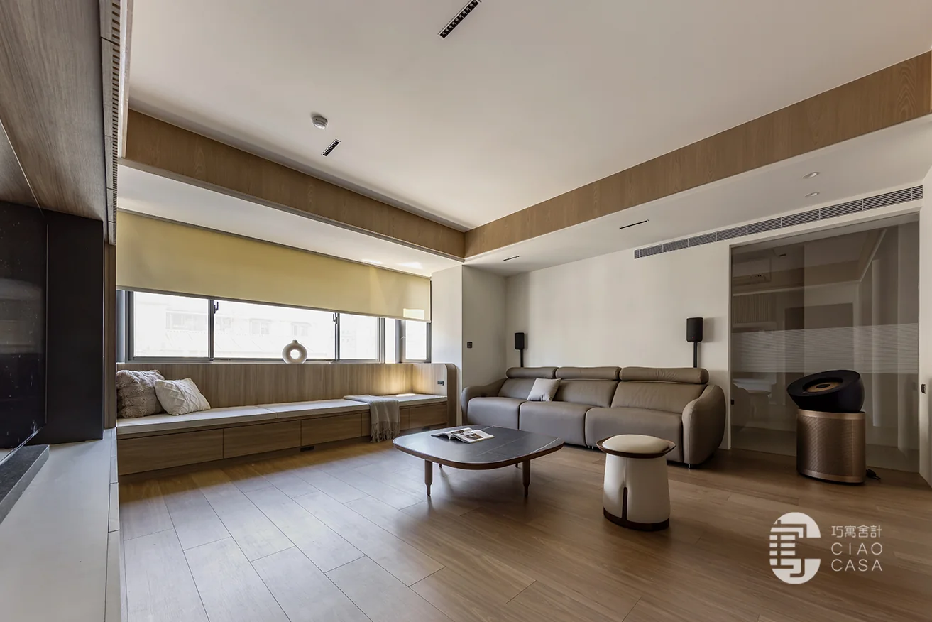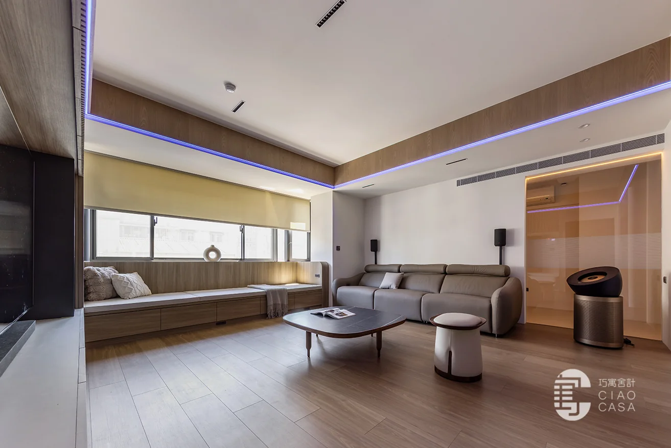 叩應歡聚與休閒的核心題旨,客廳不僅承擔日常起居的重心,更是一方凝聚歡笑與情感的家庭劇場。設計師善用多邊形角窗前的閒置區域,植入卡座,當親友來訪時,陽光與笑語交織,眾人有說有笑地圍坐其中,詩意與愜意兼得並存。沙發區亦預留環繞音響配置,為觀影時光添上一層包覆感,營造聲影共舞的沉浸式體驗。