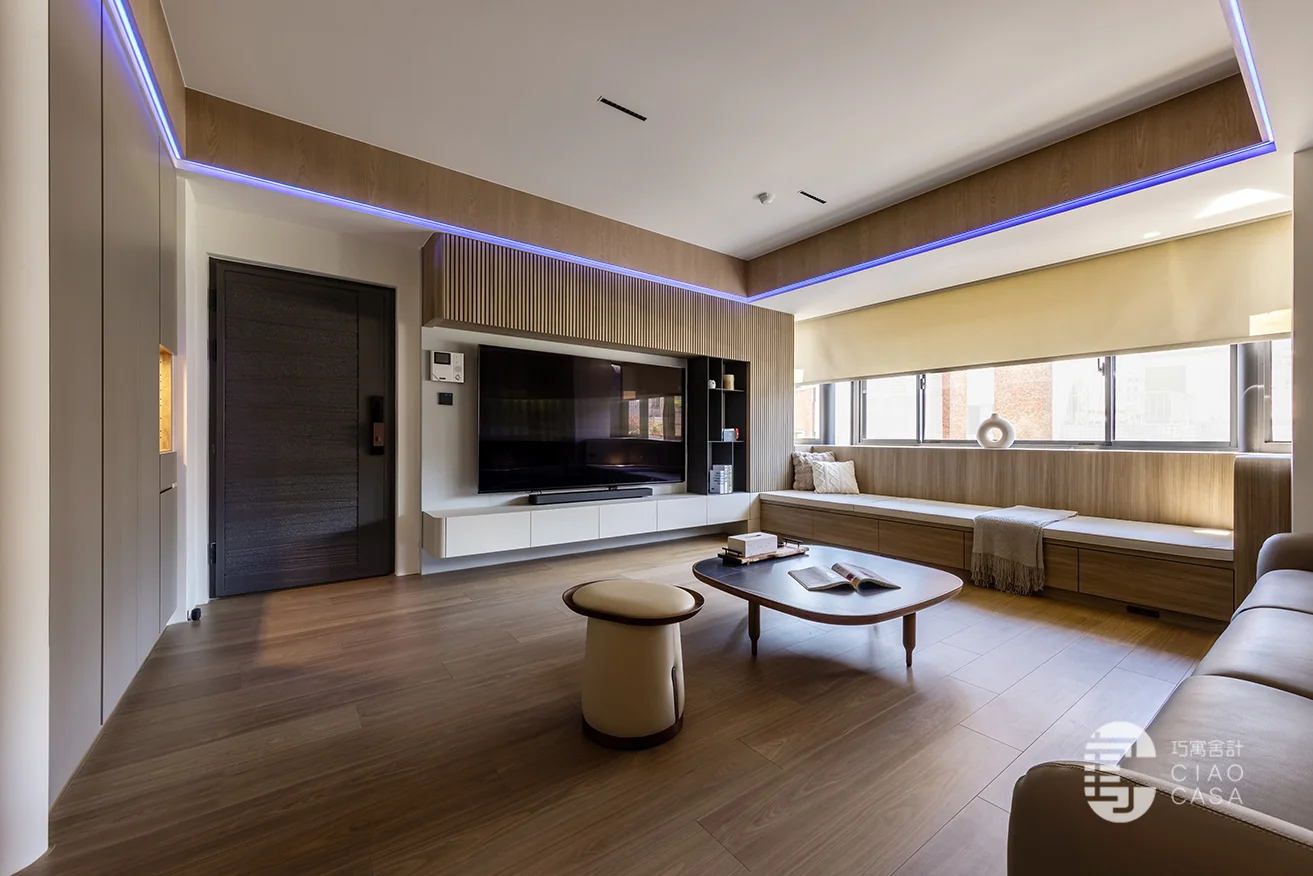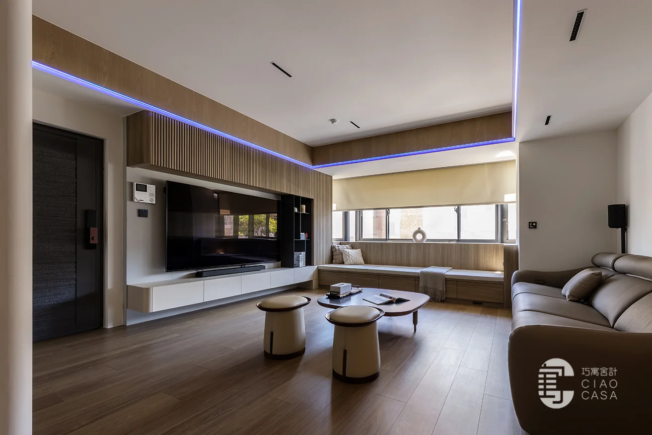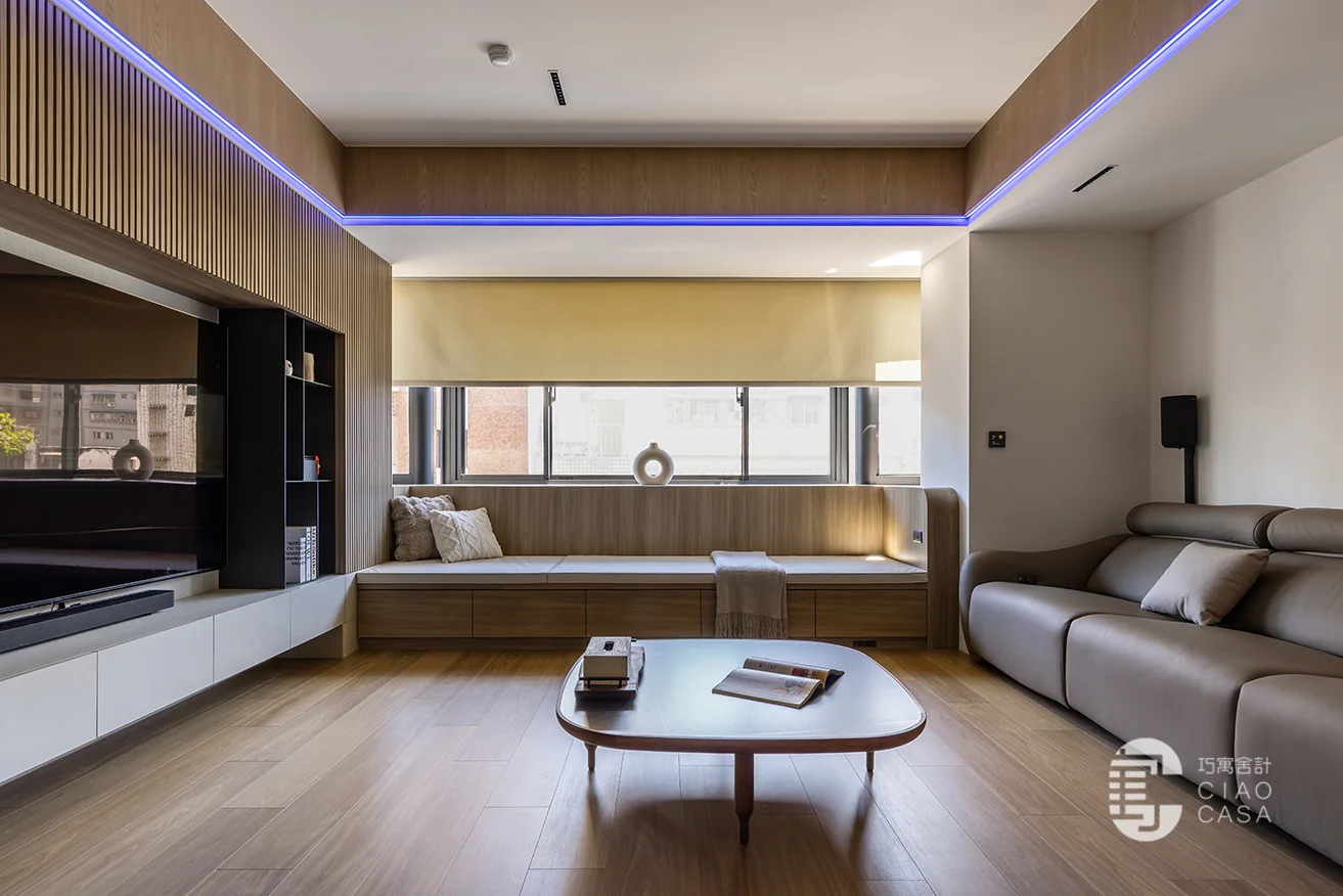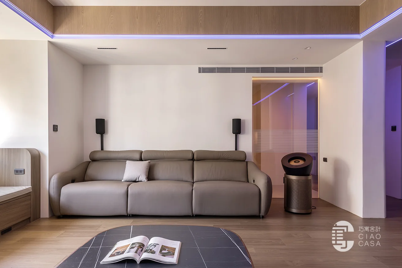叩應歡聚與休閒的核心題旨,客廳不僅承擔日常起居的重心,更是一方凝聚歡笑與情感的家庭劇場。設計師善用多邊形角窗前的閒置區域,植入卡座,當親友來訪時,陽光與笑語交織,眾人有說有笑地圍坐其中,詩意與愜意兼得並存。沙發區亦預留環繞音響配置,為觀影時光添上一層包覆感,營造聲影共舞的沉浸式體驗。