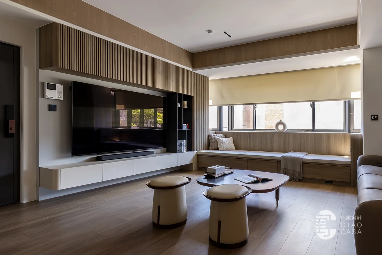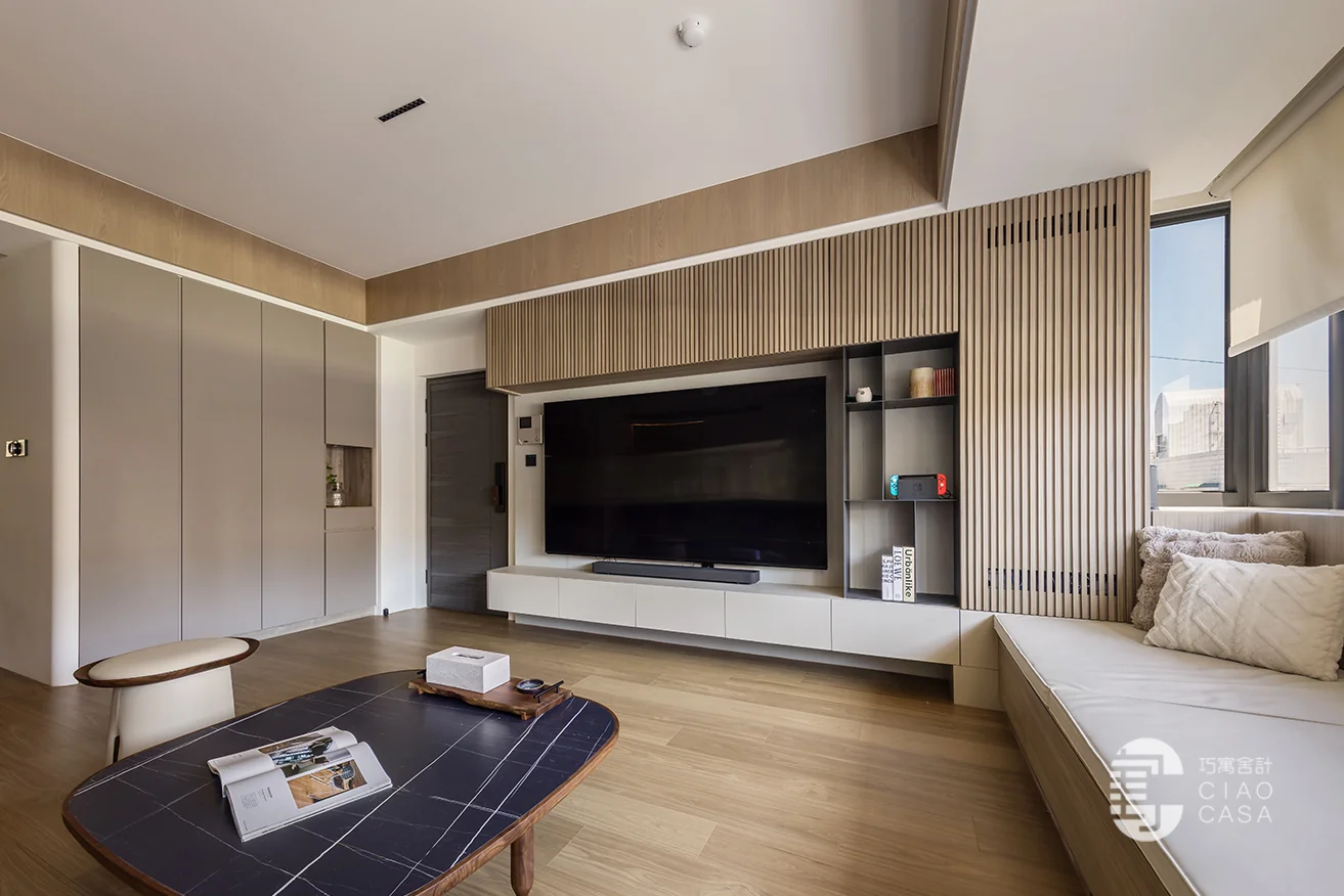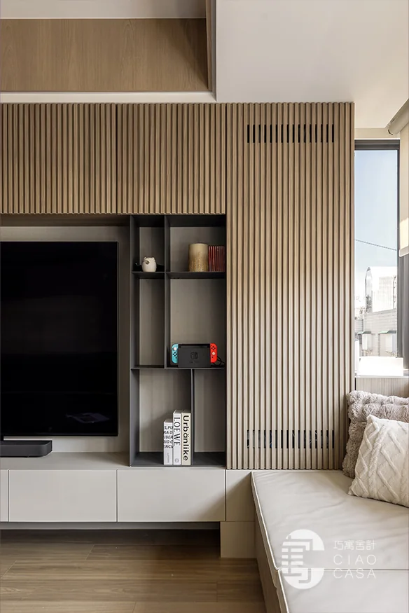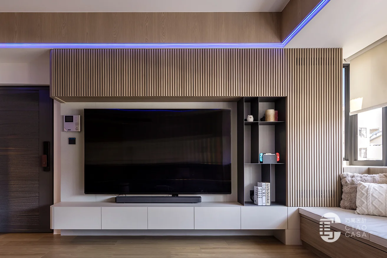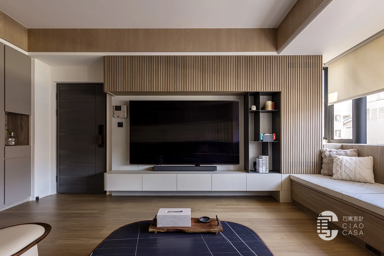 電視主牆以密織有序的木格柵為設計,彷彿擷取自然的一隅,既巧妙隱藏電箱與線路,使立面視覺簡潔俐落,又與空間的休閒氛圍和諧共鳴,定格出人與自然之間的平衡關係。