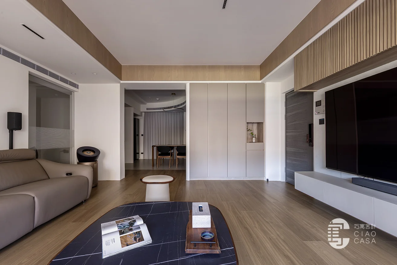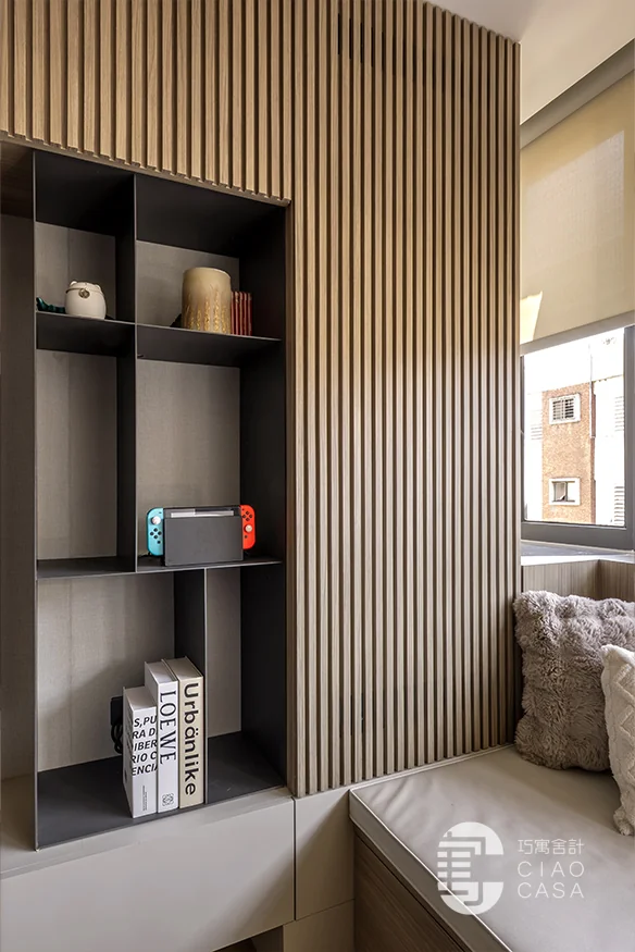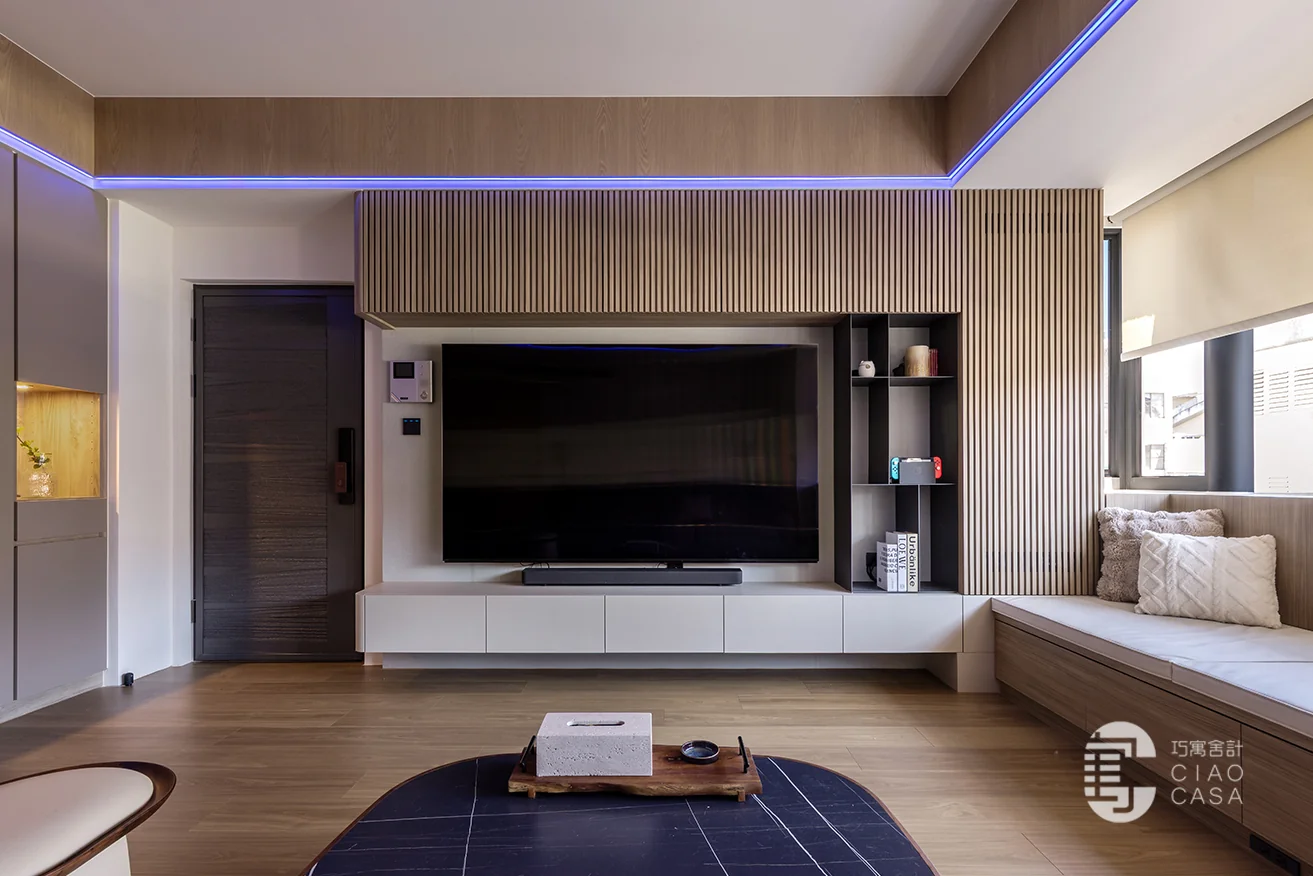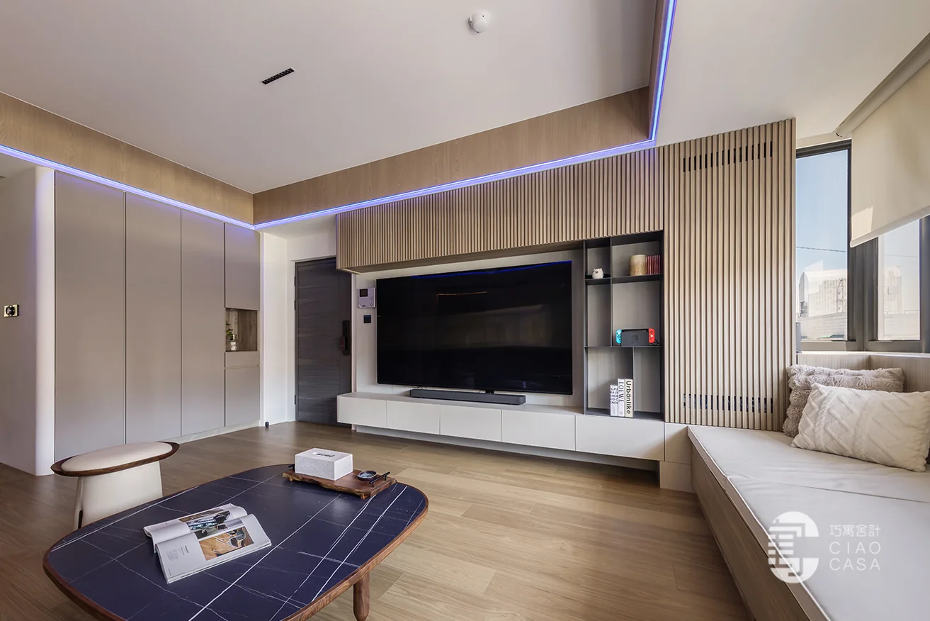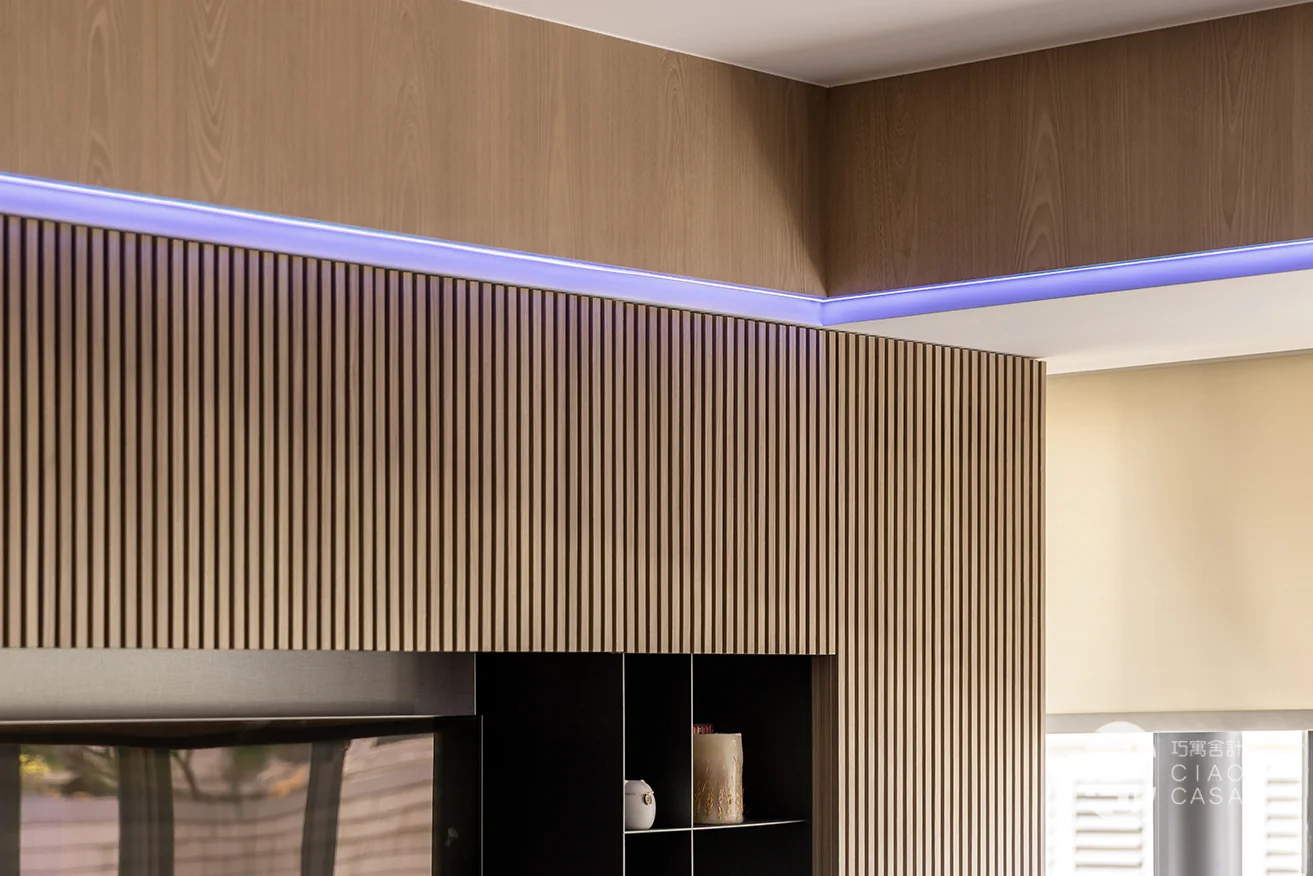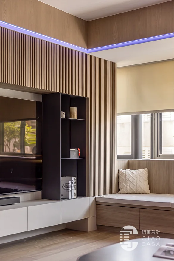 電視主牆以密織有序的木格柵為設計,彷彿擷取自然的一隅,既巧妙隱藏電箱與線路,使立面視覺簡潔俐落,又與空間的休閒氛圍和諧共鳴,定格出人與自然之間的平衡關係。