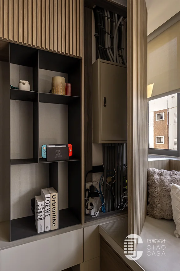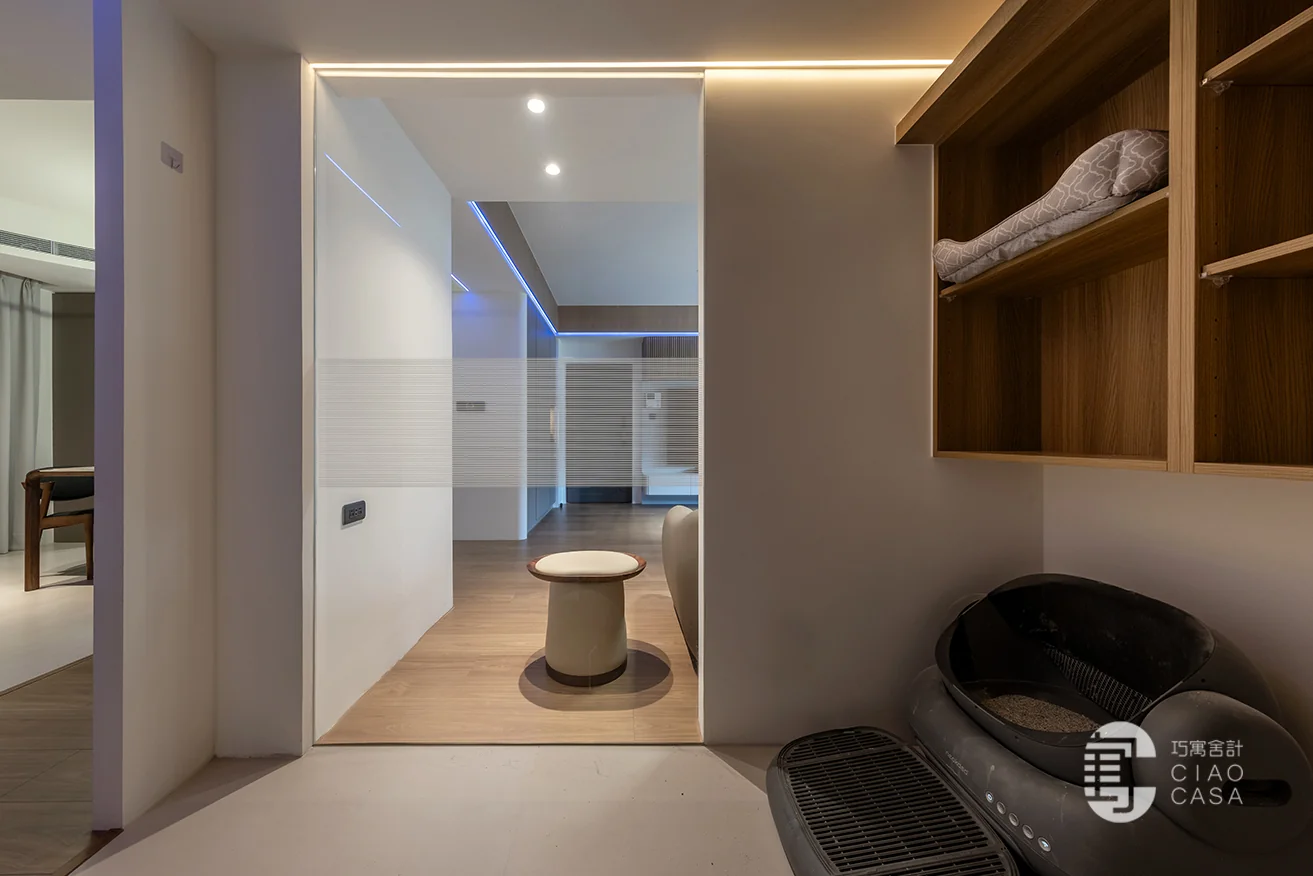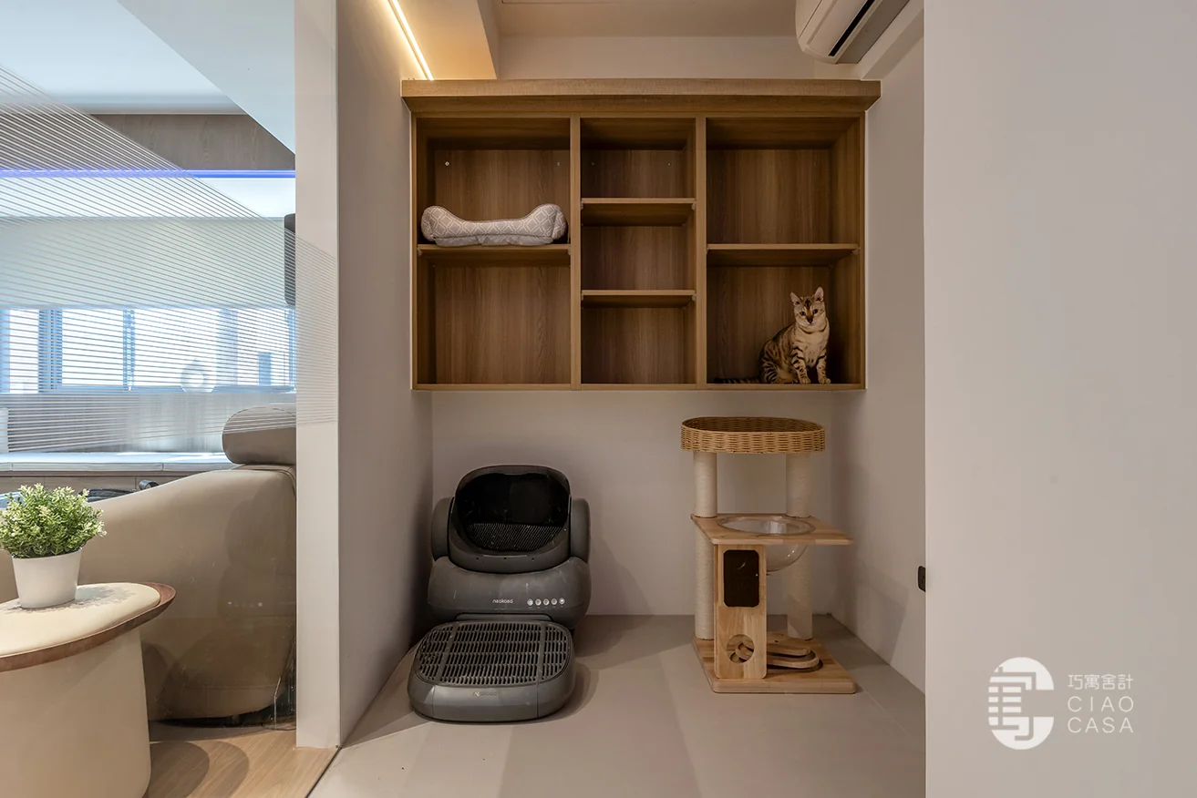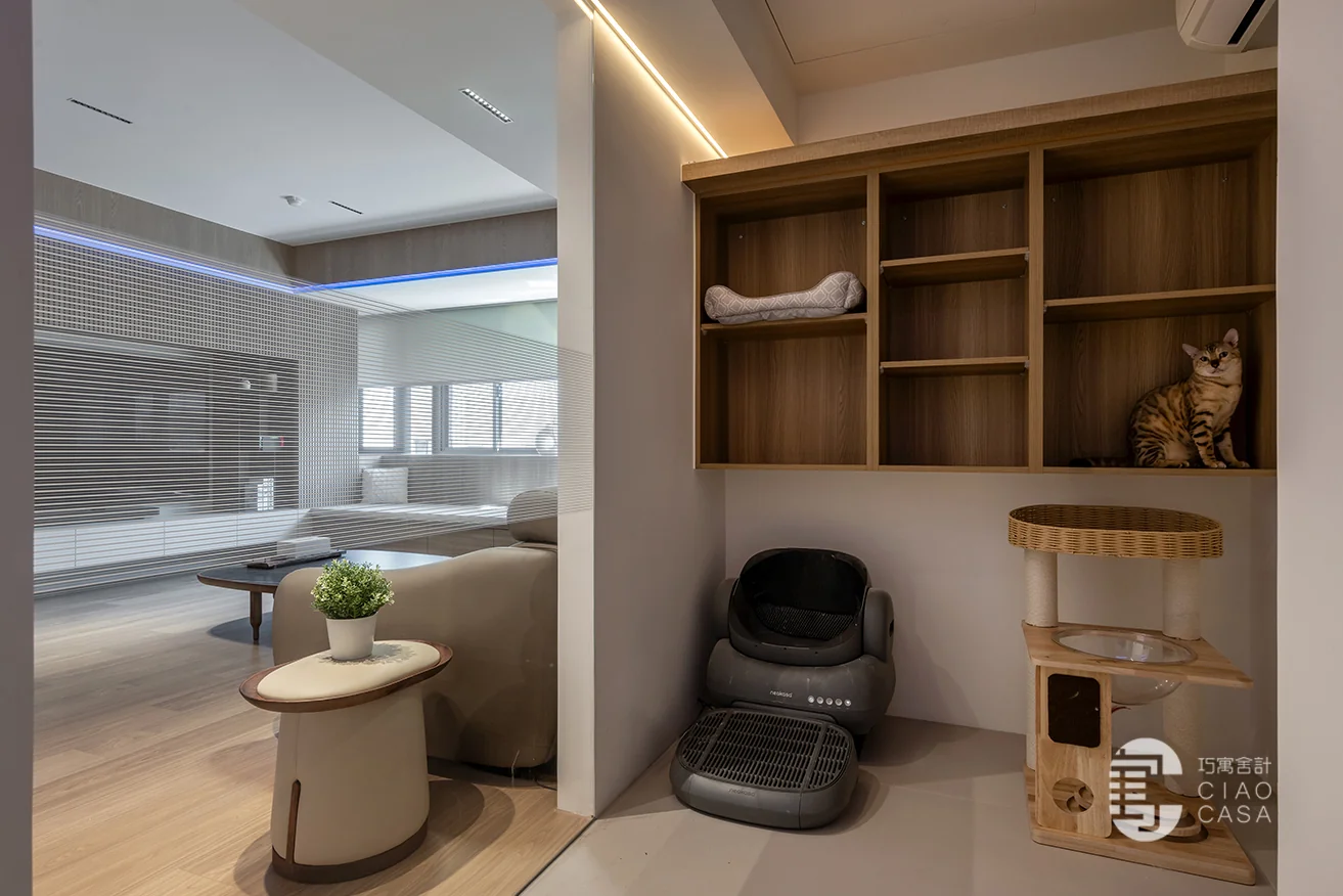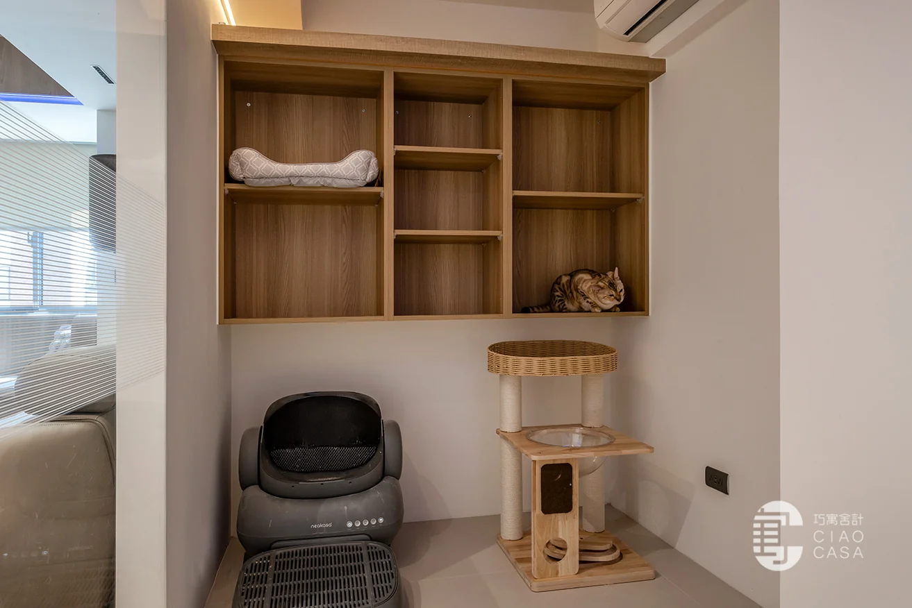 寵物房入口設於走廊一側,並在客廳開設玻璃牆面,讓屋主能隨時與貓咪互動陪伴。空間中特別預留跳台與貓砂盆的位置,並規劃可供貓咪窩藏休憩的格櫃,圍塑出既實用又充滿安全感的小天地。考量貓咪對光線敏感,整體燈光設計亦刻意調暗,營造柔和舒適的光氛環境。