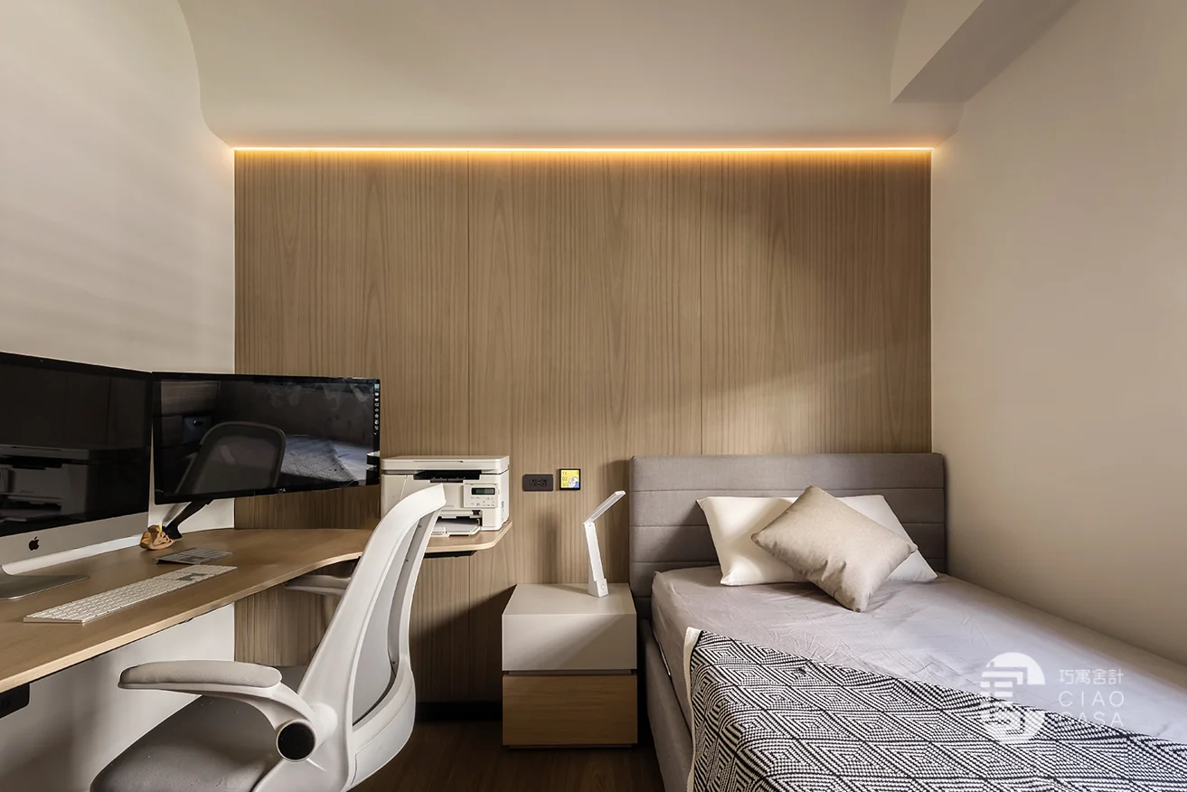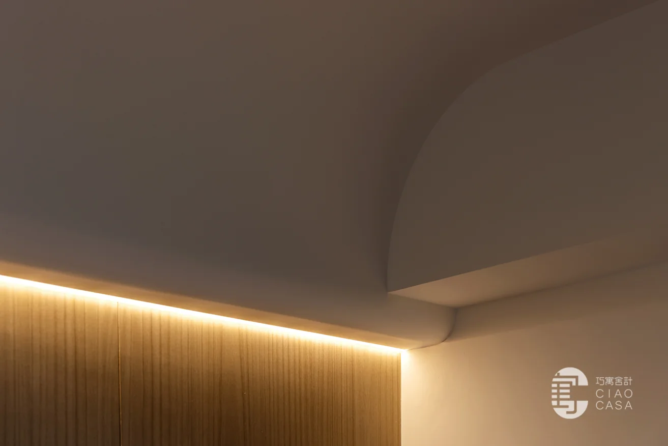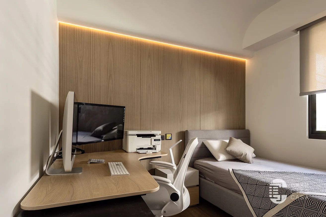 工作區規劃大尺度書桌,可容納雙螢幕與事務機,以因應高強度的工作需求;橫梁則以弧形修潤,佐以燈帶渲染柔光層次,為理性沉靜的空間注入一抹溫潤。與女兒房相鄰的隔間牆,則以衣櫃對半分置,既備足收納,也維持視覺秩序。