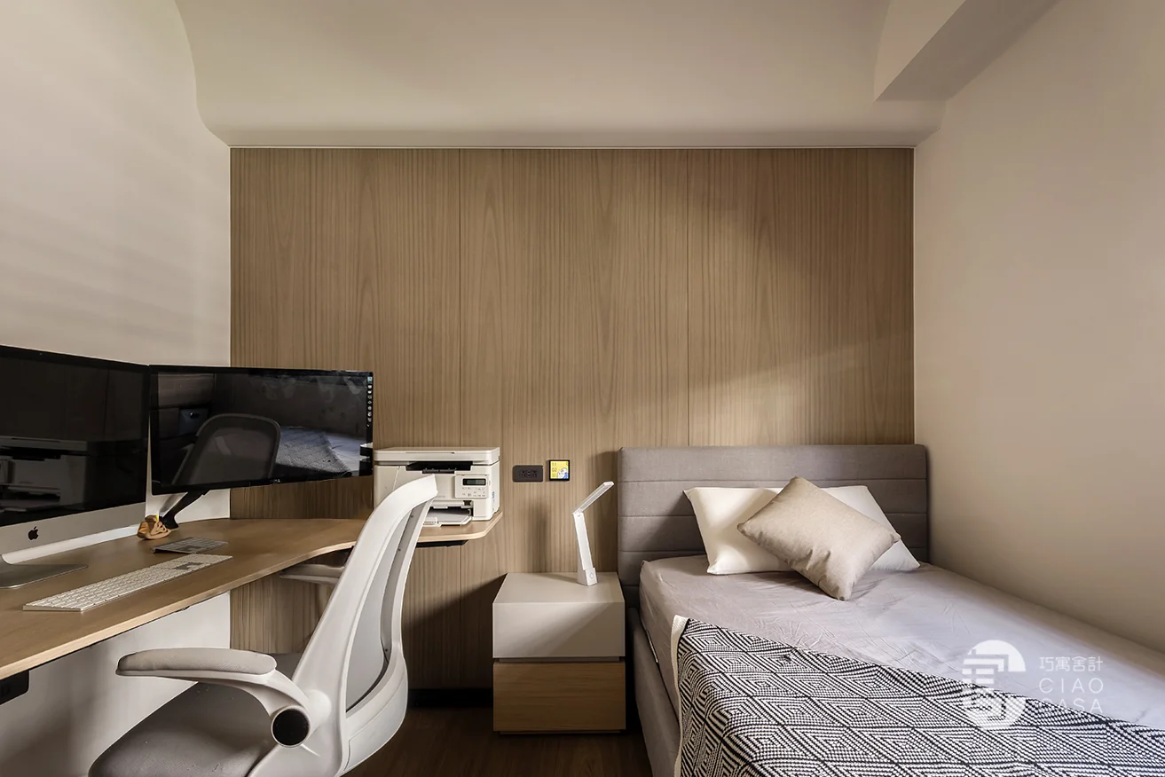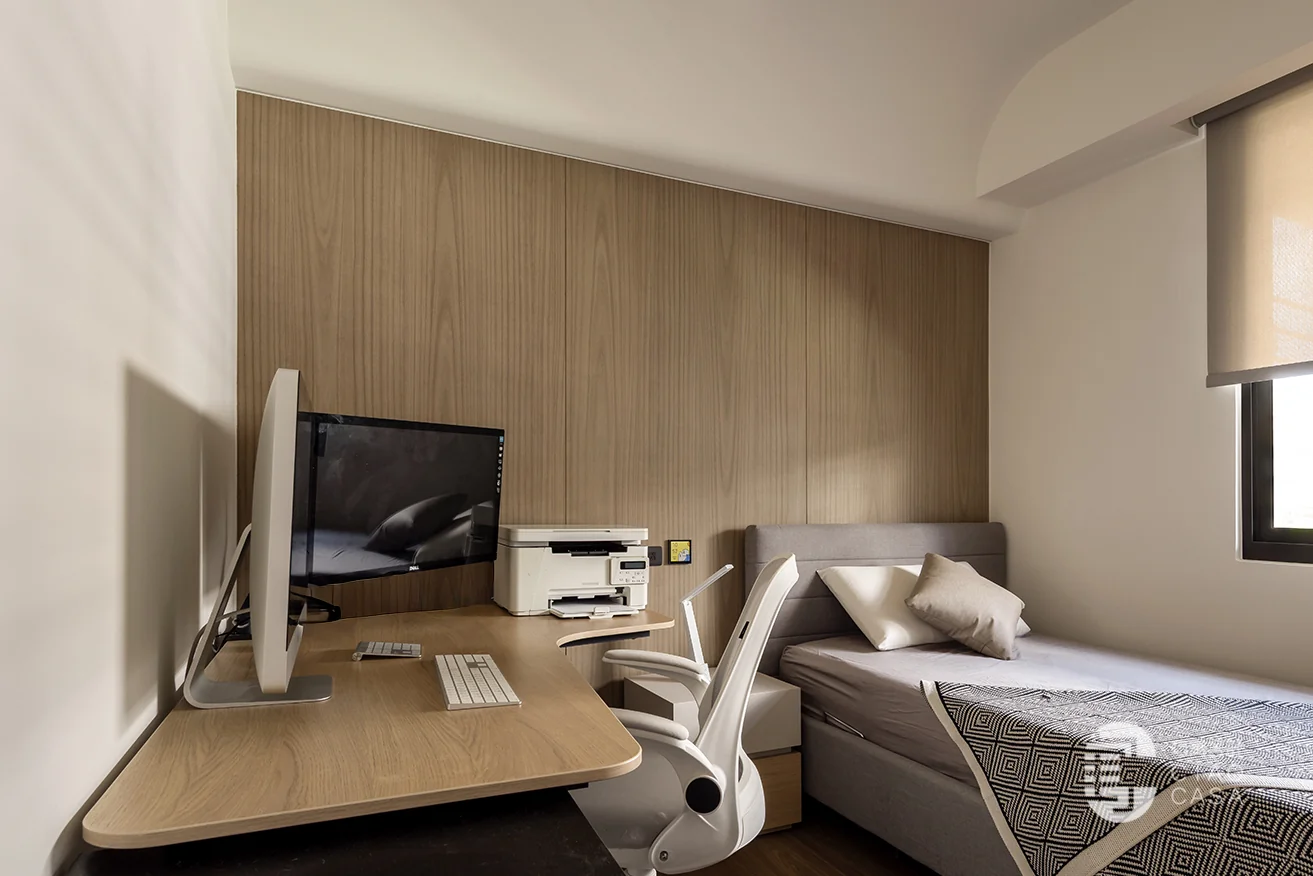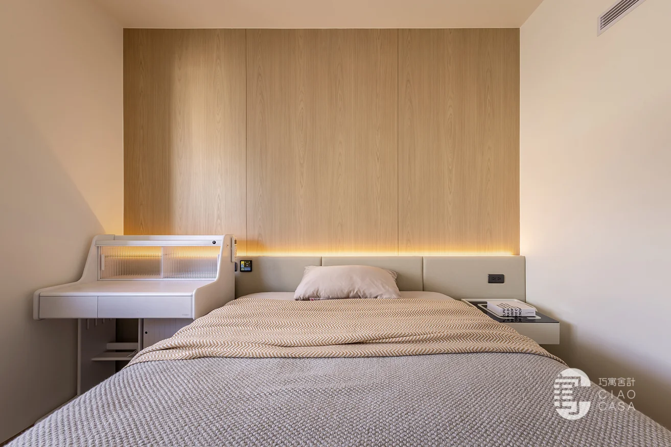 工作區規劃大尺度書桌,可容納雙螢幕與事務機,以因應高強度的工作需求;橫梁則以弧形修潤,佐以燈帶渲染柔光層次,為理性沉靜的空間注入一抹溫潤。與女兒房相鄰的隔間牆,則以衣櫃對半分置,既備足收納,也維持視覺秩序。