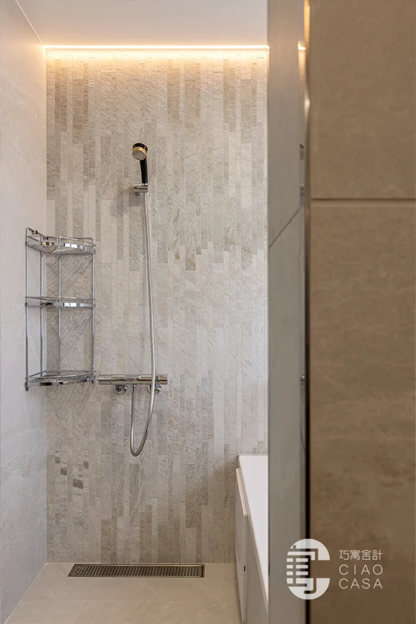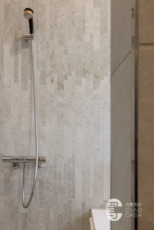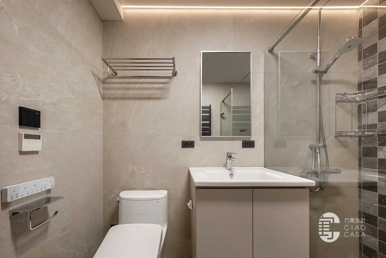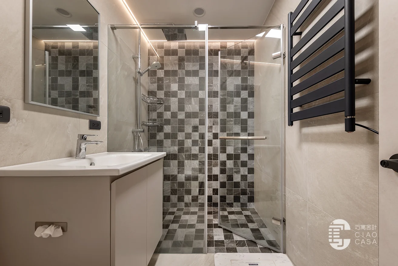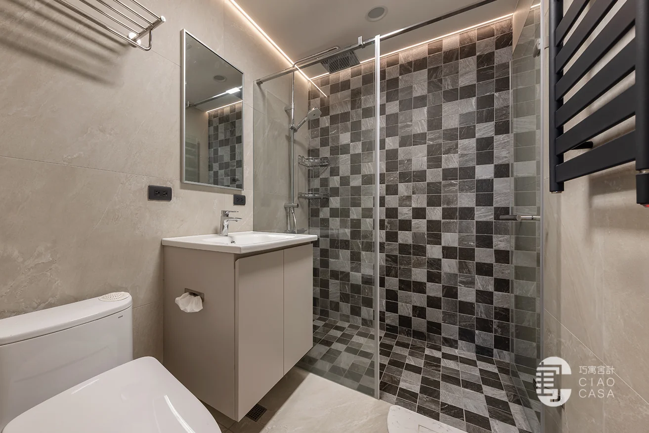 淋浴區以黑白灰馬賽克磚交織鋪設,覆蓋牆面與地面,兼具止滑功能;同時在若隱若現的光影中,鋪陳出摩登雅致的氛圍,映照居者的審美意趣。