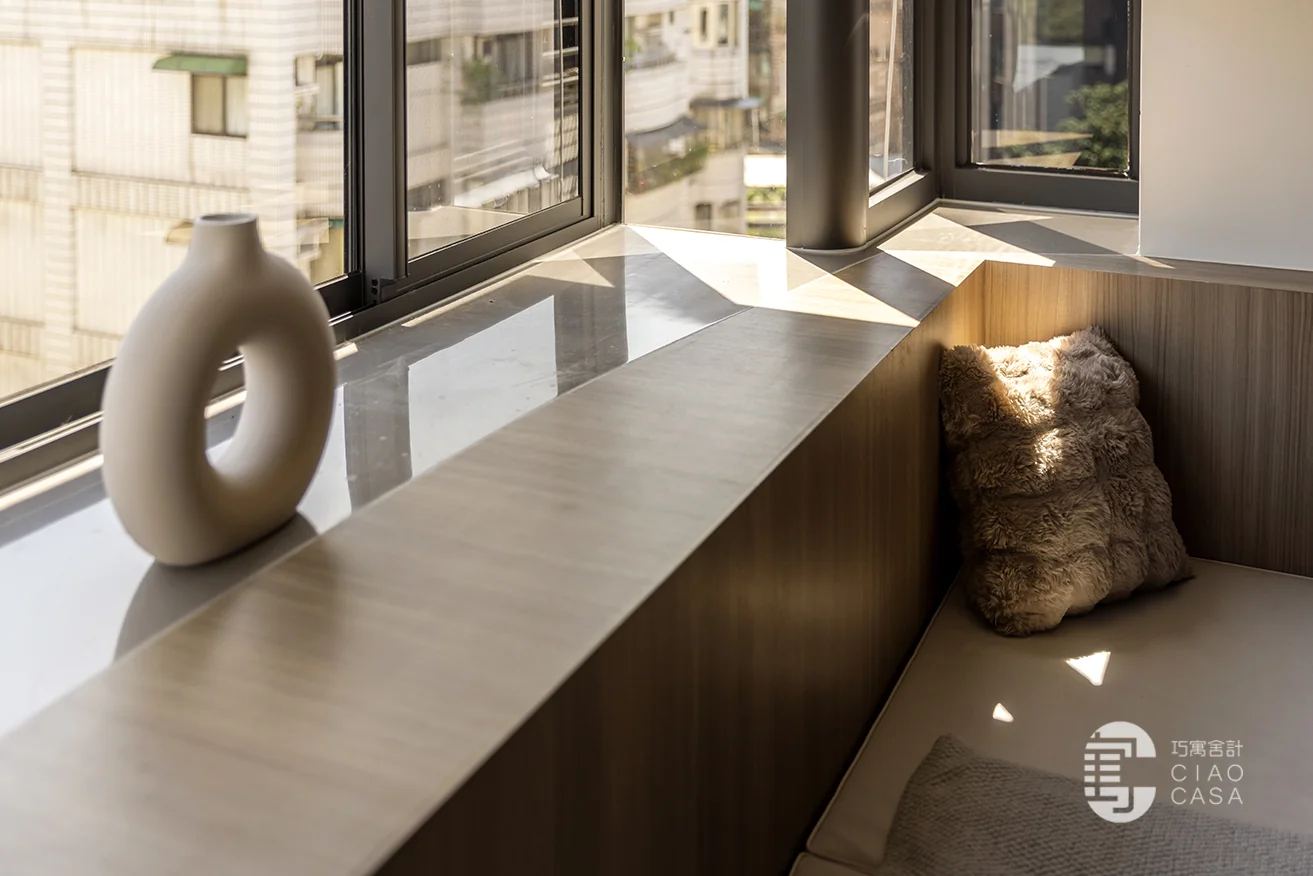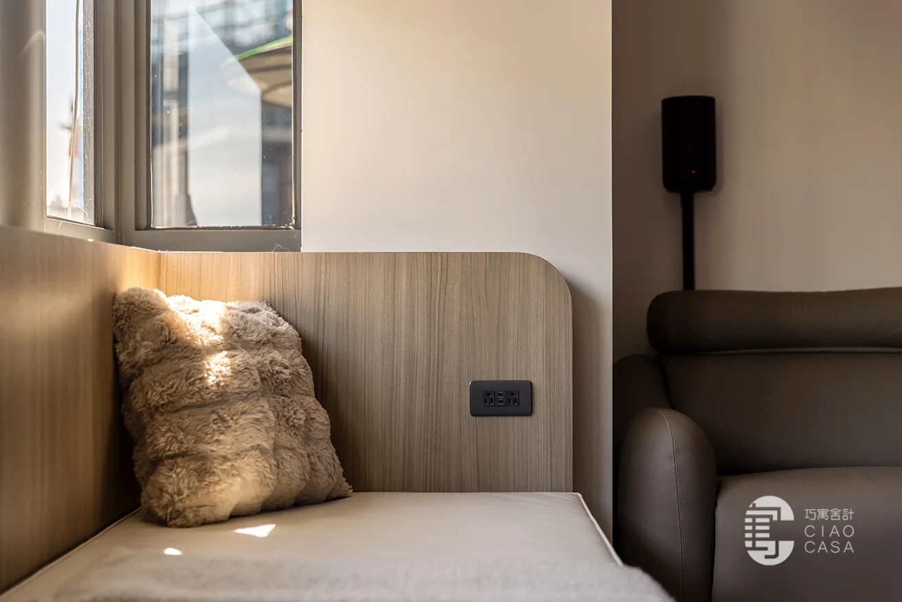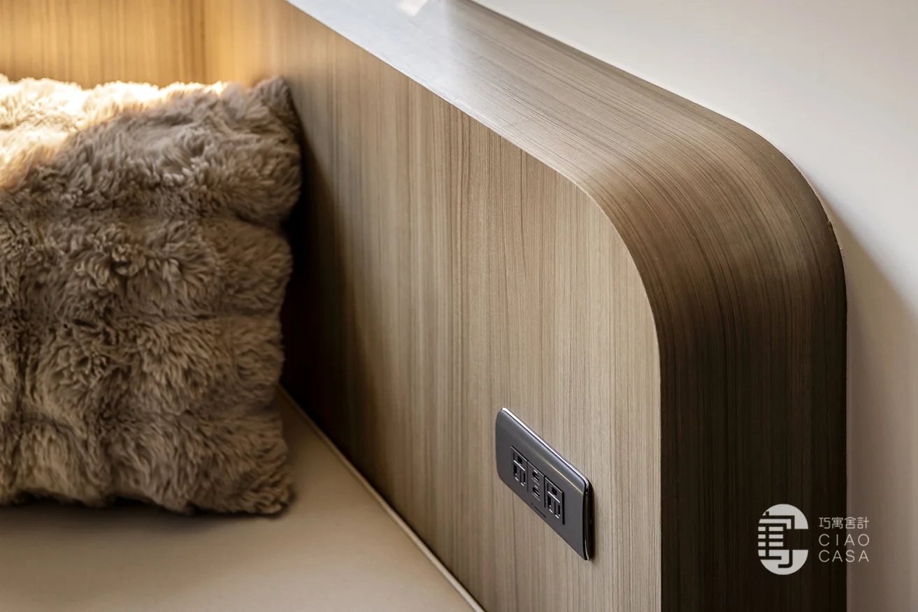 深坐的臥榻以圓弧線條勾勒輪廓,細膩貼合窗檯,同時內置電源插座,方便來訪客人使用,細節之中盡顯主人體貼周到的款待之心。