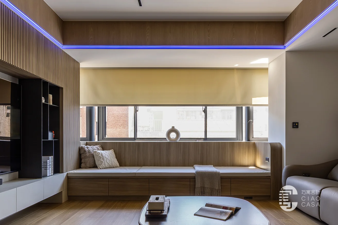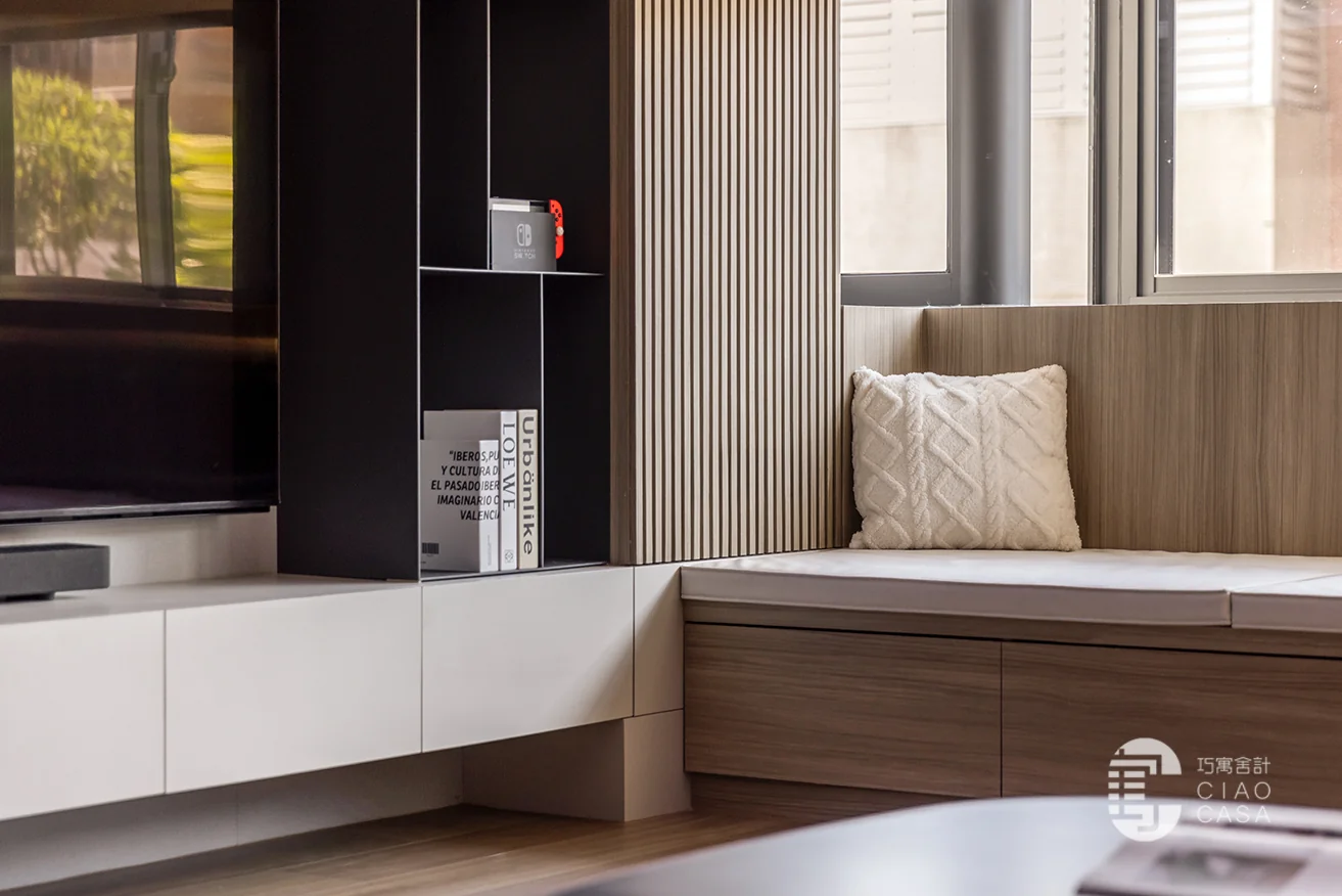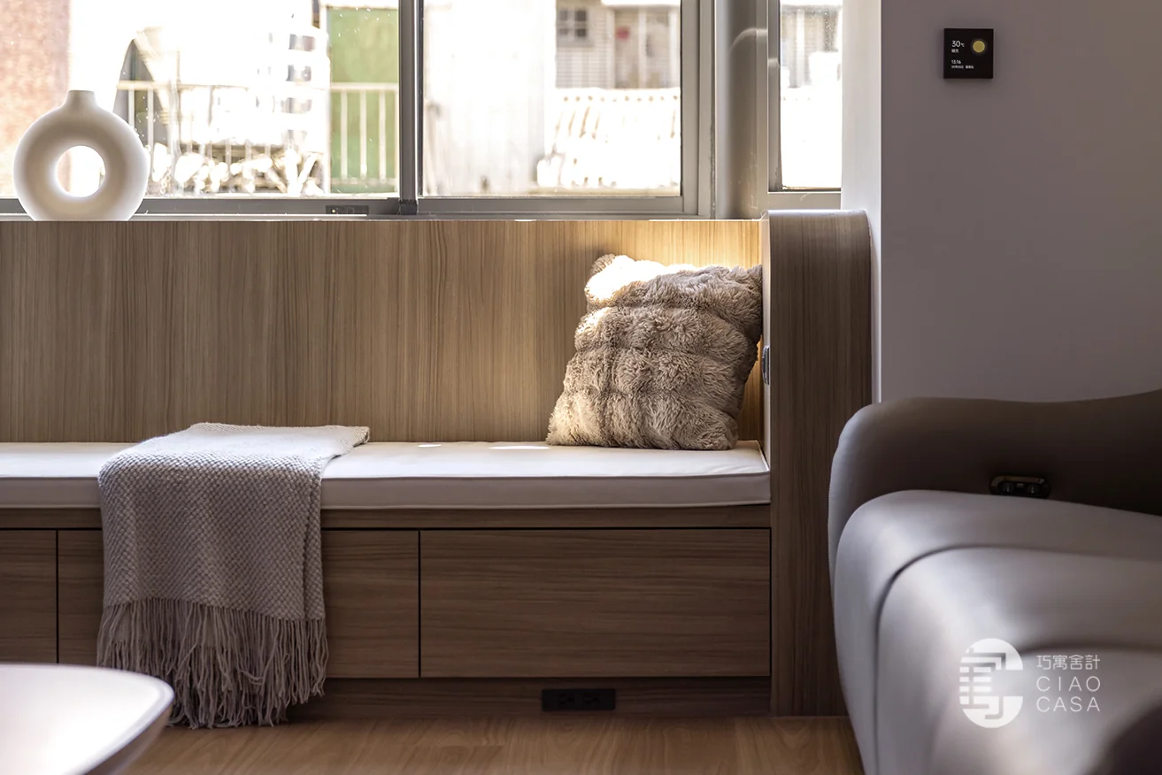 深坐的臥榻以圓弧線條勾勒輪廓,細膩貼合窗檯,同時內置電源插座,方便來訪客人使用,細節之中盡顯主人體貼周到的款待之心。