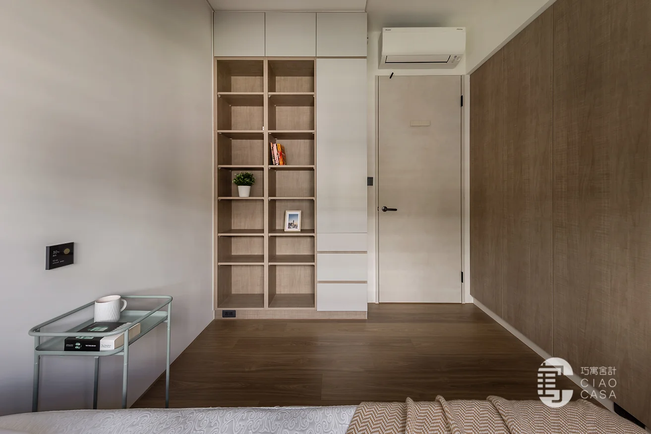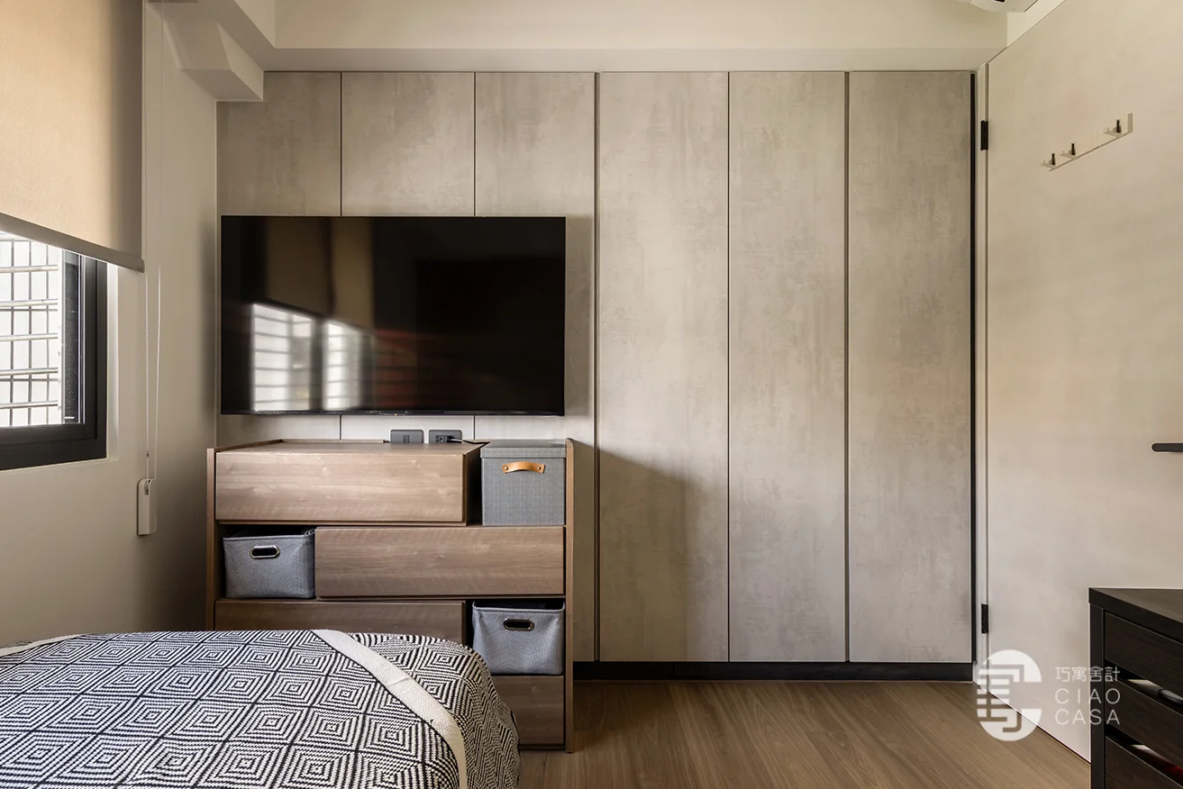 經常埋首於工作的男主人,其主臥融合起居、辦公與休憩機能,形構出流暢連續的生活切面。空間以簡約清雅的材質語彙,搭配帶有不加修飾的灰樸立面,讓男主人能以自在狀態,遊走於隨性與隨心之間。