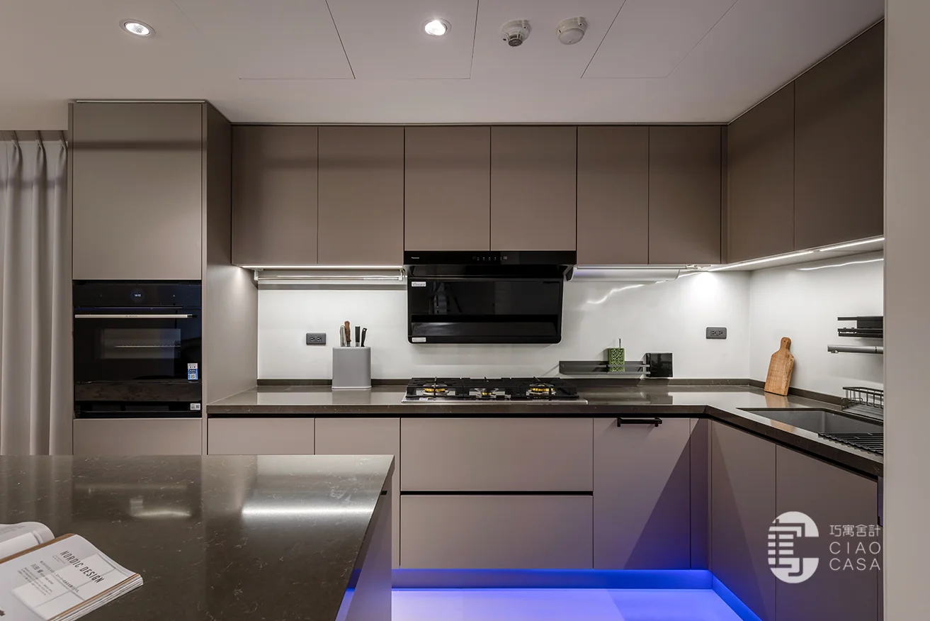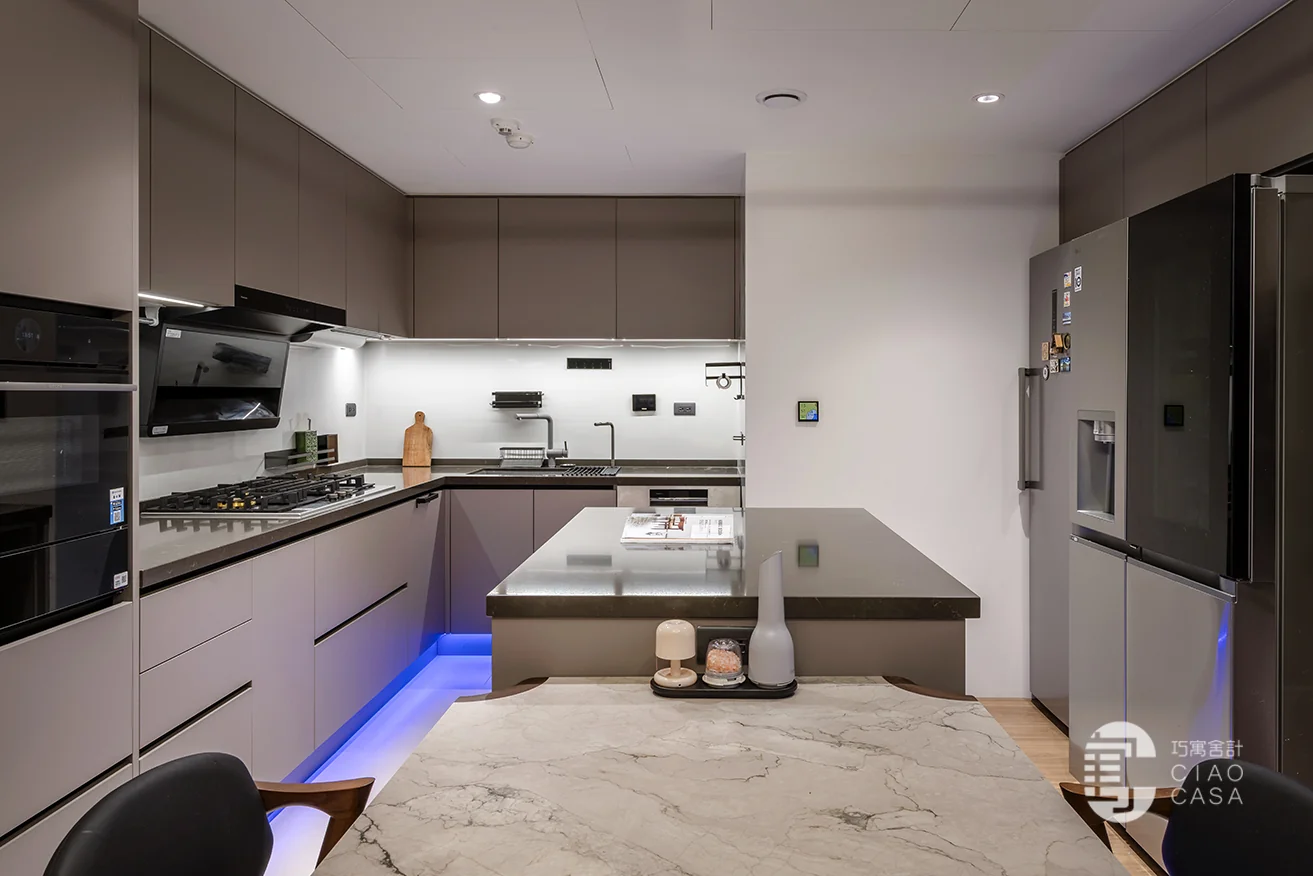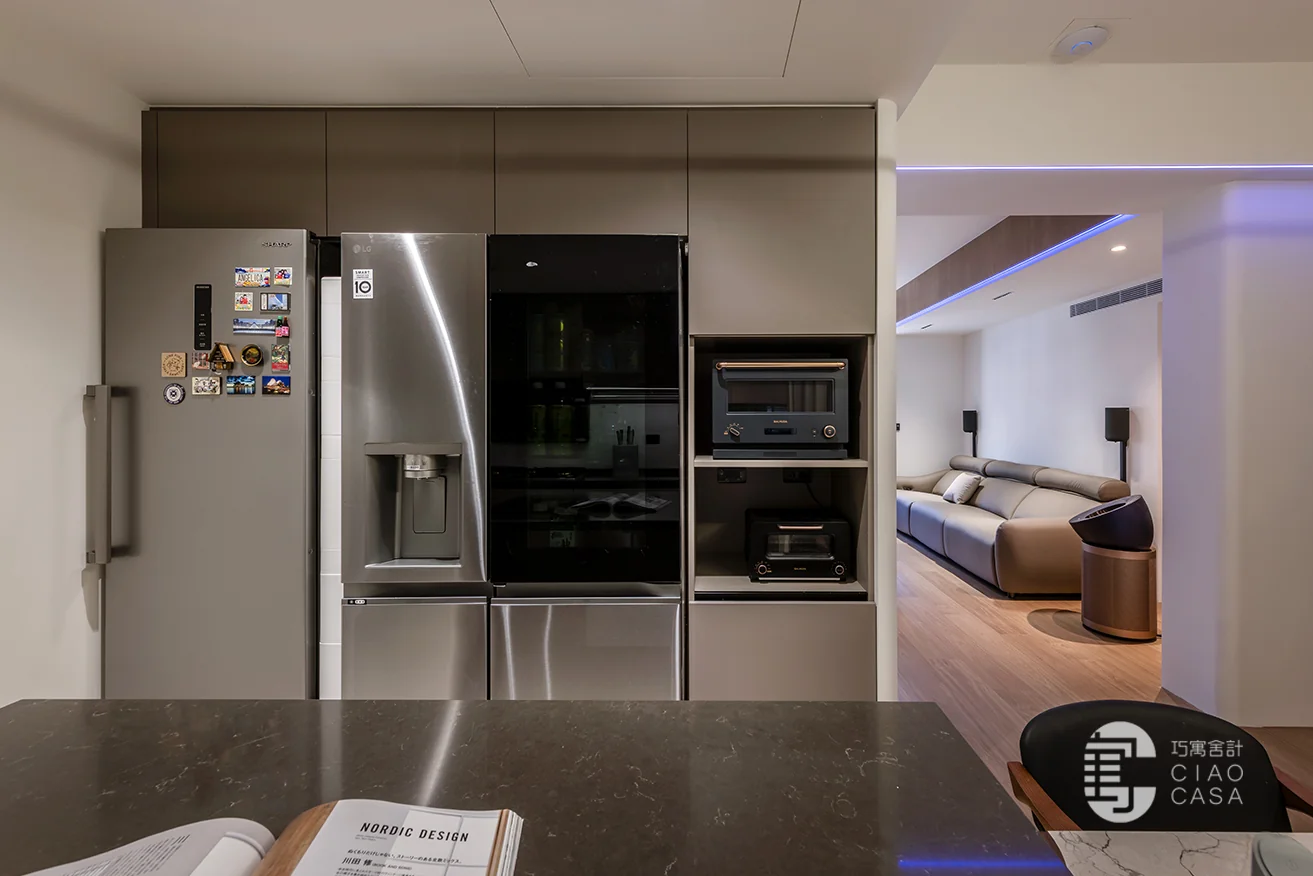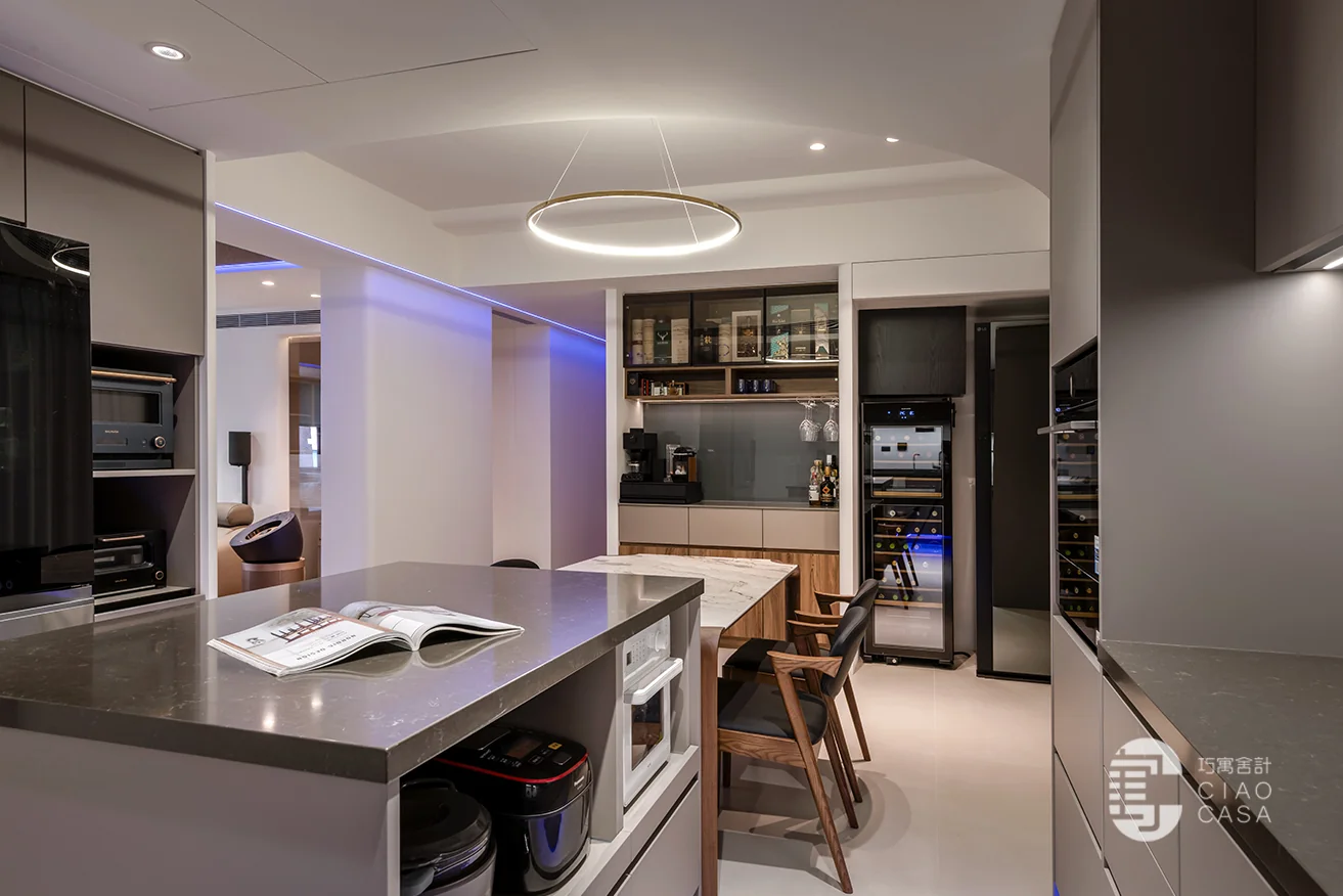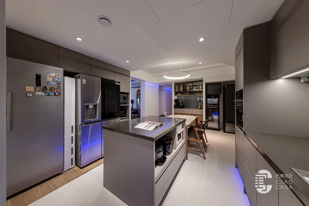 由於外籍友人時常來訪擔任客座私廚,舉辦餐宴與烤肉派對等活動,設計師將自身對澳式生活方式的理解融入空間之中。規劃專業廚房、大型冰箱、冷凍櫃、備餐區與酒藏吧台,不僅滿足高端宴請的需求,也兼顧日常使用的便利,讓空間生長出更多關於料理與歡聚的美好可能。