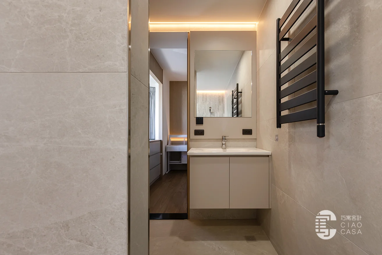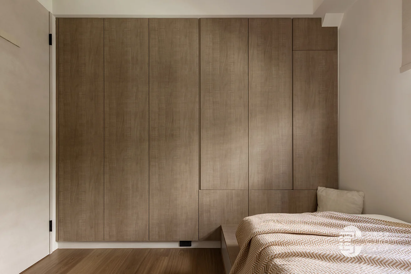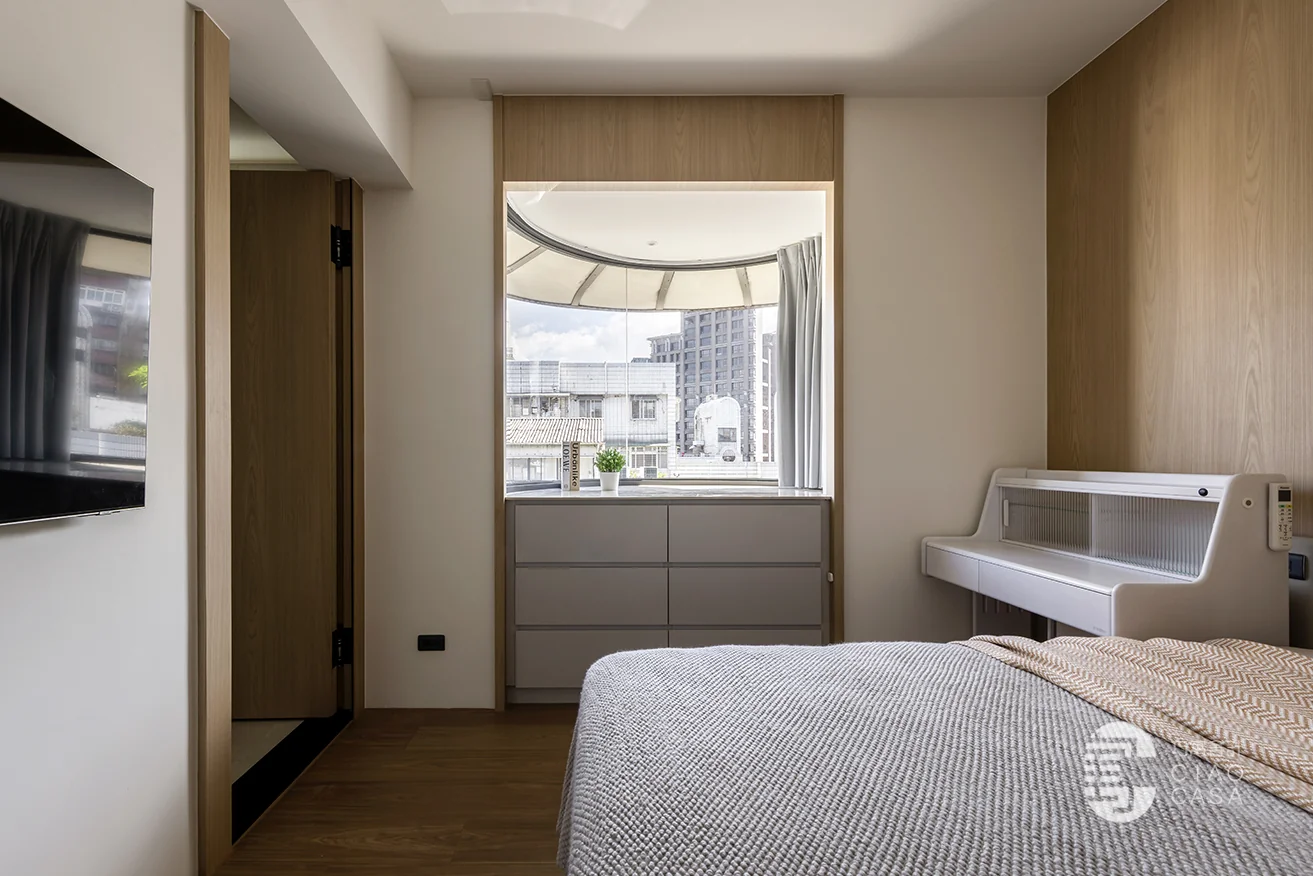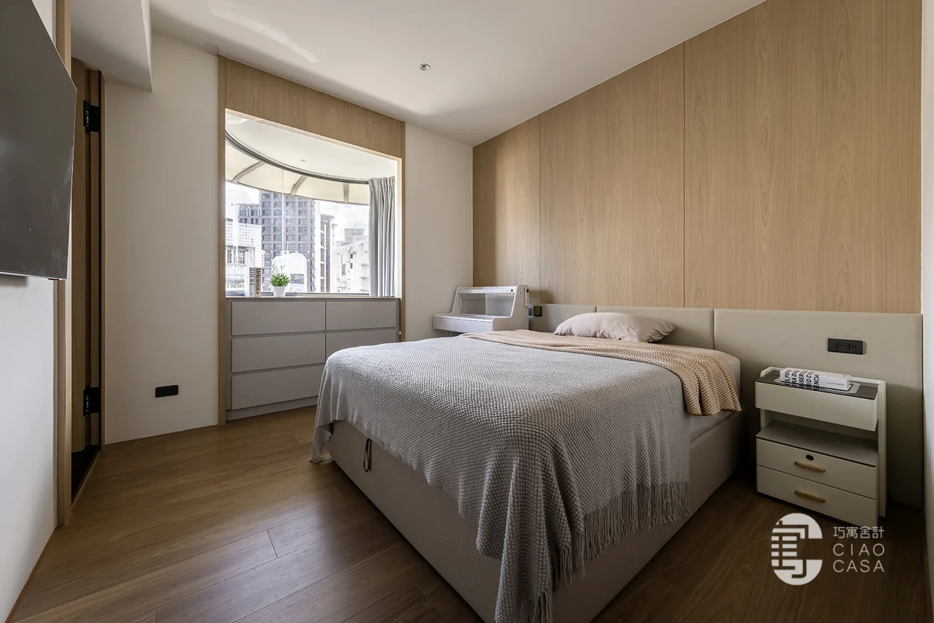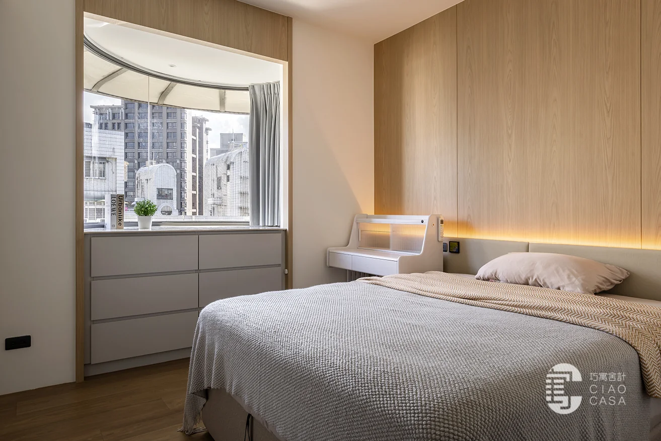女主臥以簡約線條與自然材質鋪陳,氤氳出不遺餘力的慵懶與靜謐,在細節微末之間,道敘精神上的留白與從容。外推飄窗則設置斗櫃,納入半分天光、半分生活,開啟一場與自然和自我的深層靜默對話。