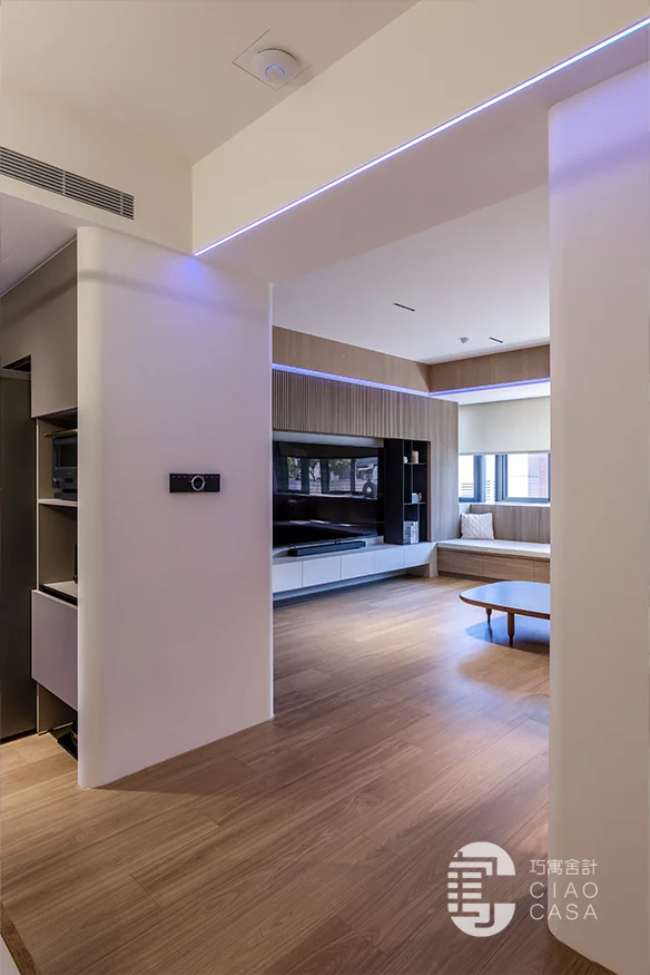 覓光而行,豁然開朗,是設計師在譜繪動線上的用心所在。空間一進又一進,流暢銜接,貫連兩域,循著光帶延展,讓視線與步伐自然過渡。此外,更利用儲納端景的量體,使入口自成視覺框景,生活的儀式感不言自顯。