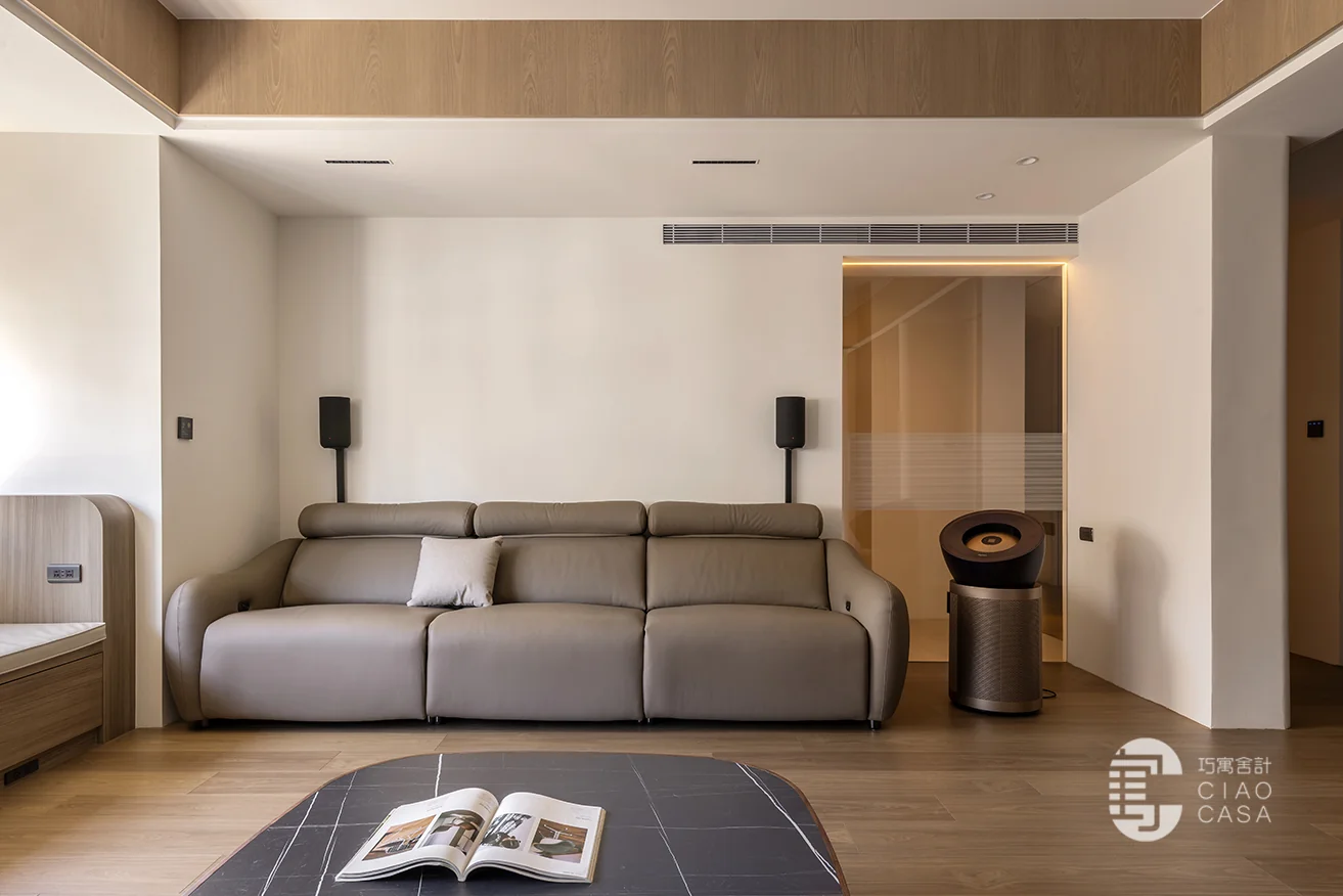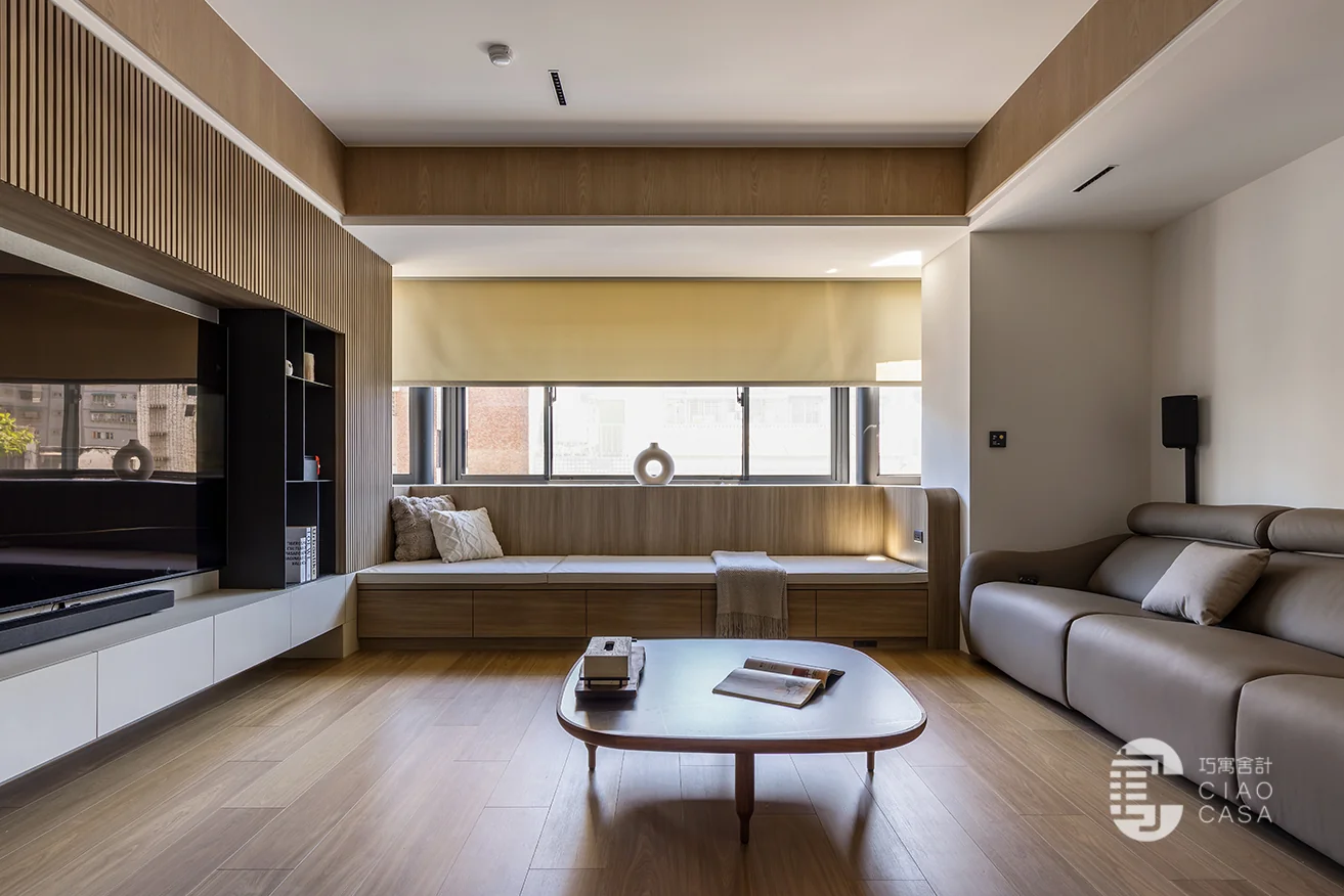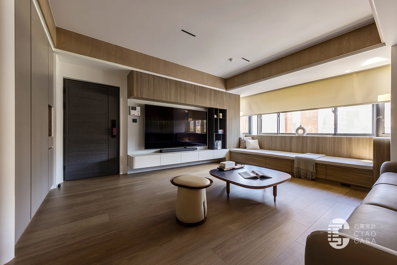 空間剝離繁冗裝飾,只留下光與材質的真實交會。天花顯著的橫梁結構,以柔潤木皮環繞包覆,佐以流光溢動,描繪出溫煦樸潤的空間氣息,與居者內心產生共鳴。閒坐於此,望向窗外,無論雨潤如絲,抑或晨光熹微,皆能於紛繁之中澄澈本心,讓思緒歸於純粹,生活回歸本真。