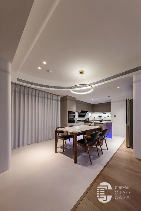 藉由主燈、嵌燈與燈帶等主次燈源的層次分佈,靈活轉換光氛,無論是迷離幻影的微醺之夜,或溫馨靜謐的家常時光,皆能詮釋出空間情調的多重表情。