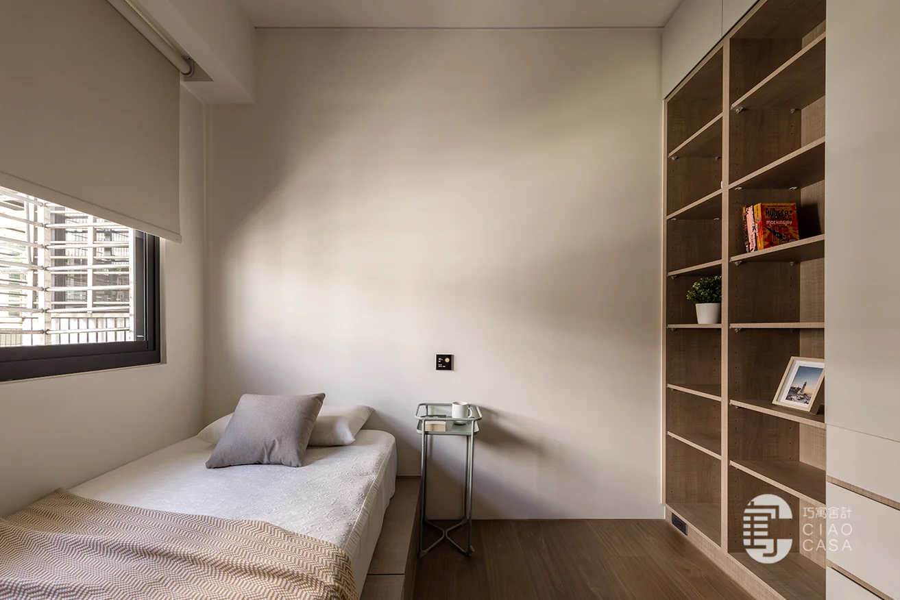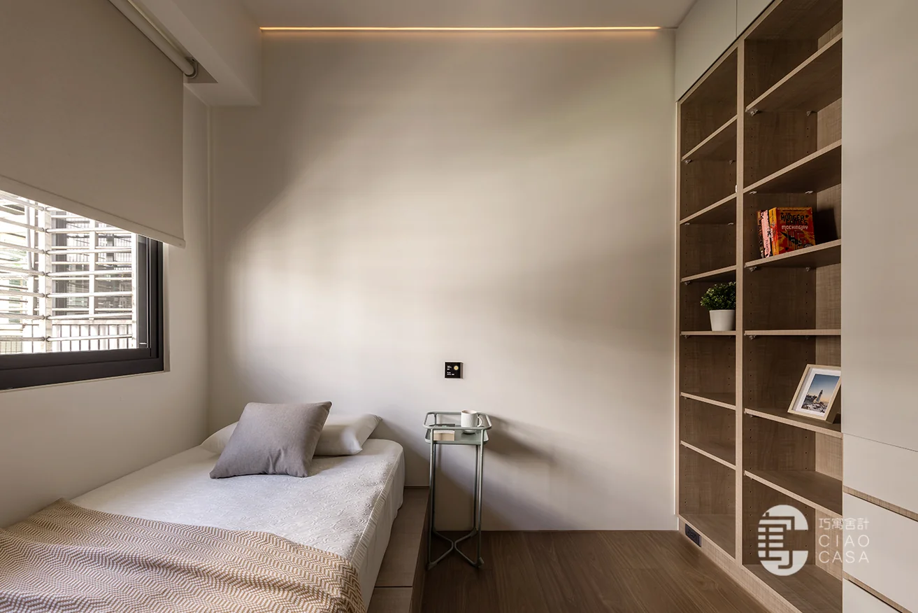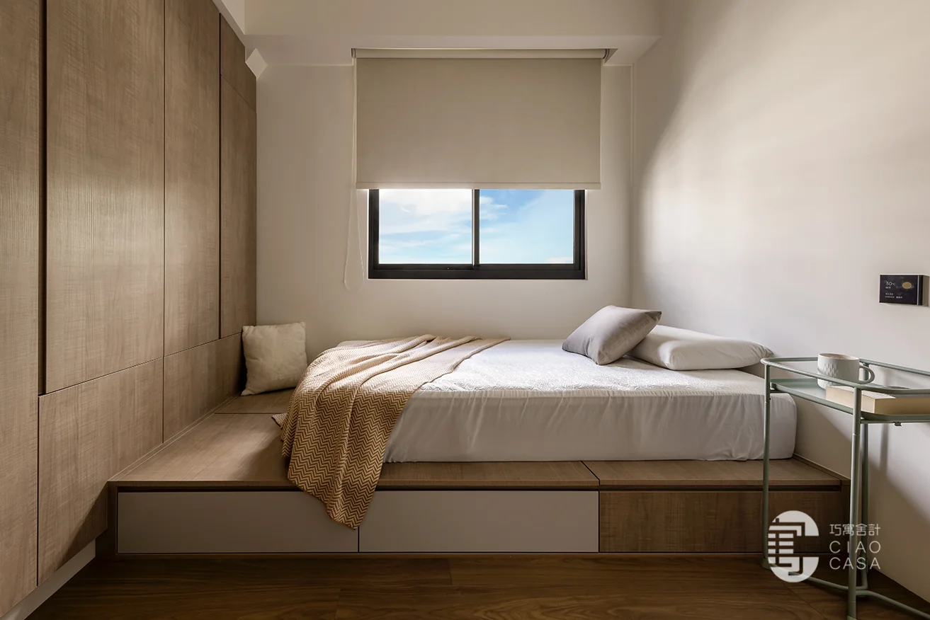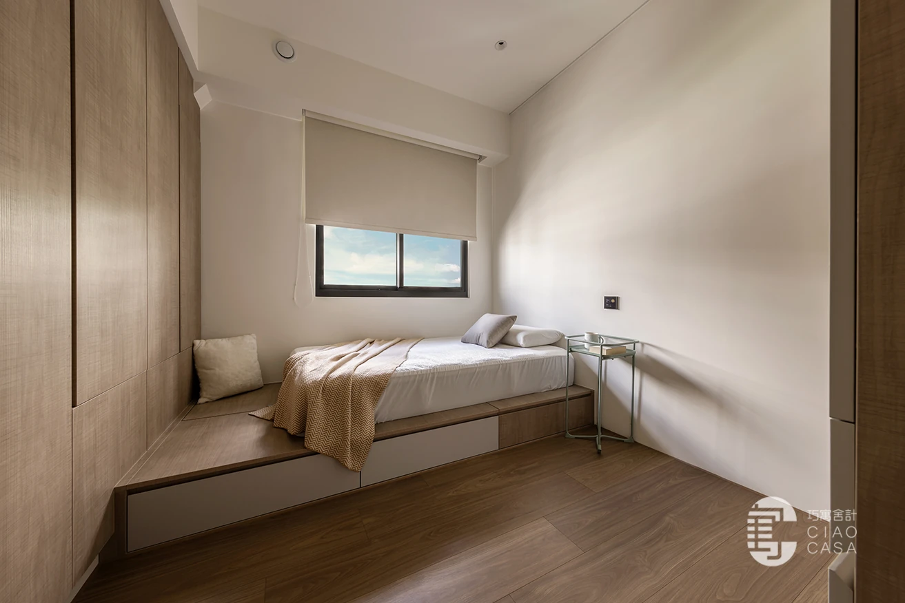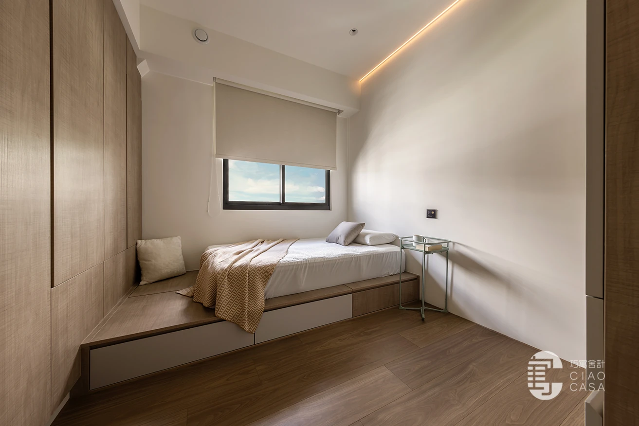 長居國外的女兒偶爾返家小住,臥房以架高臥榻床,借助層高變化,增添生活的趣味性與儀式。溫潤的木皮與柔和暖光相偕,醞釀出返家的安心與歸屬感。