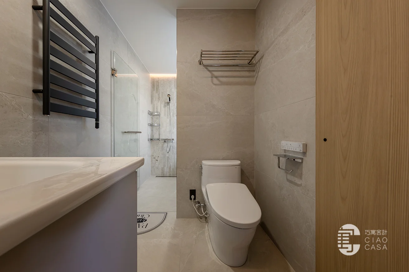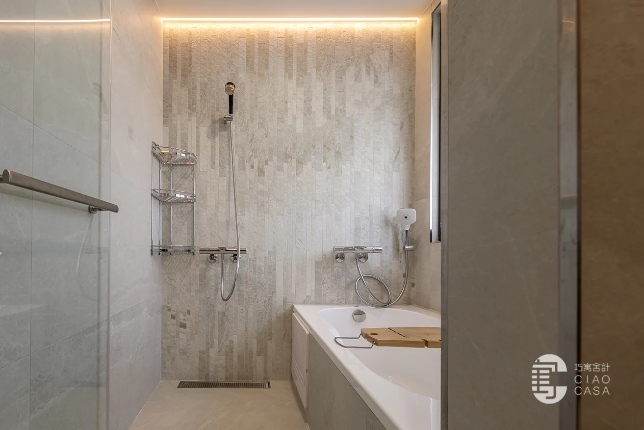 主臥衛浴採日式二進式動線設計,梳洗區與泡澡區分而有序,滿足對度假與閒適的嚮往。