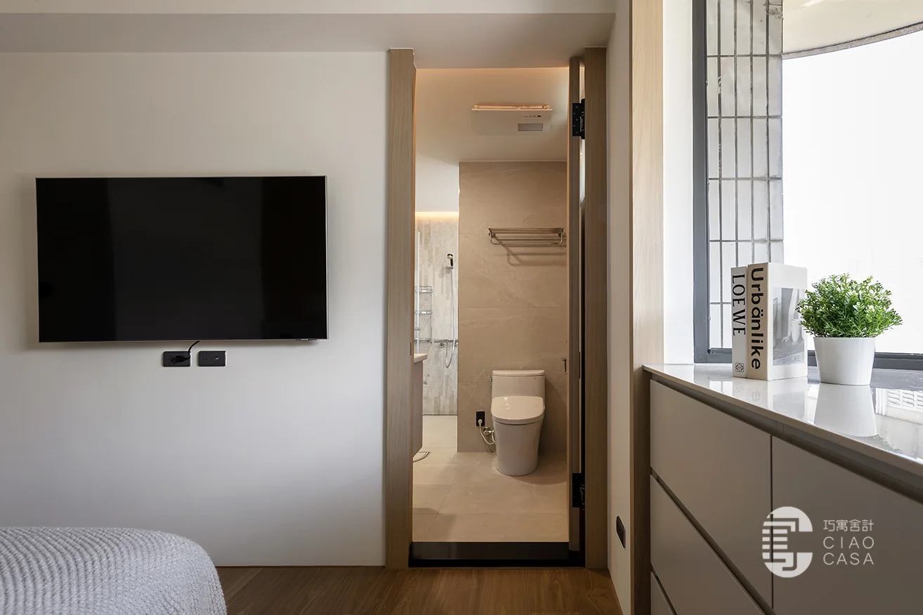 空間以軒敞開放的姿態串聯客廳與餐廳,窗面拓展至最大限度,引入充沛的日光、綠意與清風,讓自然因子在室內自由流動。這片為歡聚而生的休閒場域,不僅是日常起居的延伸,更是招待外籍親友、舉辦私廚與派對的理想場所。而「雙主臥」的型態,讓夫妻在同一屋簷下,也能各自擁有一方靜謐天地,在獨處之中安放身心,回歸生活的寧靜與自在。